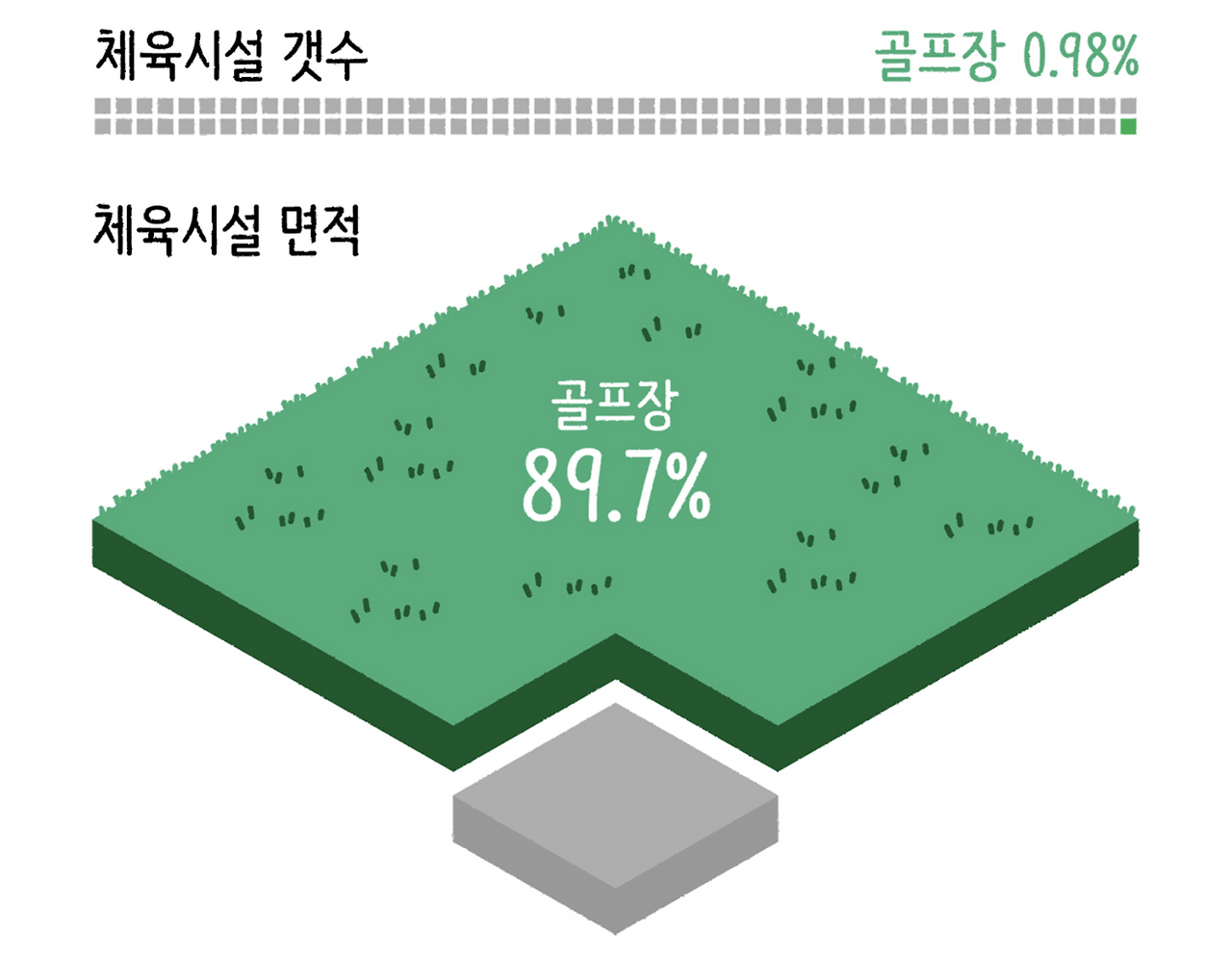체육관도 산 깎아서 만들고, 수영장도 산 깎아서 만드는데 왜 골프장만 갖고 난리야!? 라고 할 수 있다. 하지만 그 비율을 보자. 전국의 체육시설에서 골프장의 비율은 0.98%에 불과하다. 1%도 안된다. 하지만 면적으로 살펴보면 전체 체육시설 면적 중 골프장이 차지하는 면적은 89.7%이다. 사실상 우리나라 대부분의 체육시설 공간을, 갯수로는 1%도 안되는 '골프장'이 차지하고 있는 것이다.