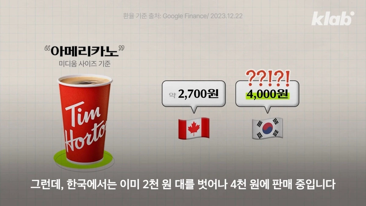 아니, 선생님. 저렴한 국민 카페라면서요. 혹시 한국이 캐나다보다 선진국이고 GDP가 높은건가요? 아니면 정부에서 우리 몰래 커피에 어마어마한 세금을 붙이고 있는 건가요? 무엇을 종합적으로 검토했으며, 저렇게 비싸야 될 이유는 무엇인지?
