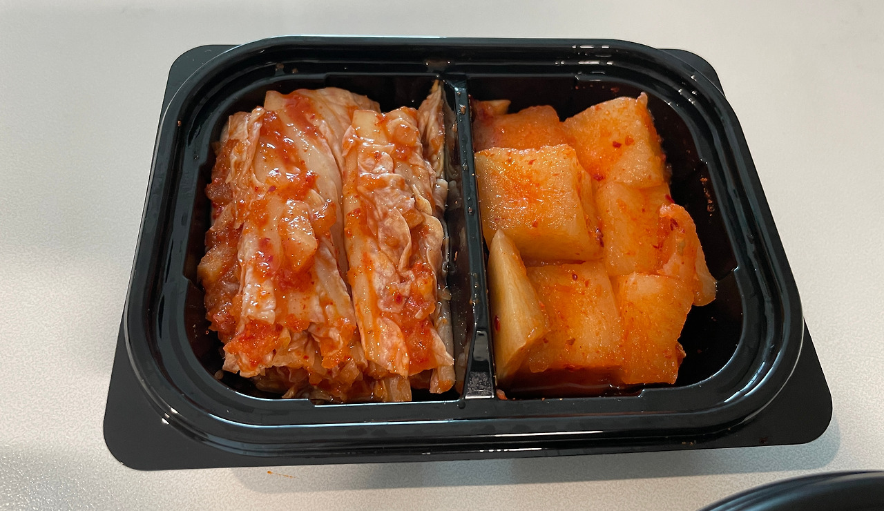 김치, 깍두기다. 배추가 크다. 중국산 김치를 대량으로 구매해서 내주는 건 아닌 것 같다.