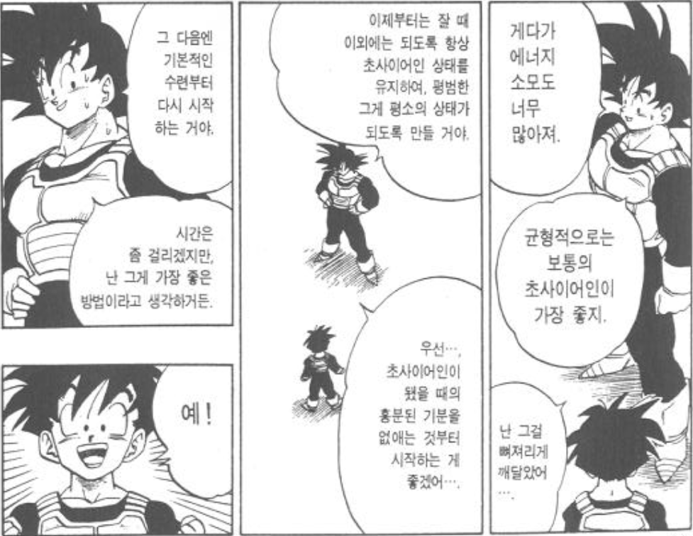 손오공은 패배를 싫어한다. 그래서 초사이어인 상태의 단점을 보완, 교정하고자 한다. 전투에서 흥분은 하등 좋을 것이 없기 때문이다. 그래서, 그는 극도의 분노를 참아내고 낮고 얕은 흥분 상태를 유지하며 초사이어인 상태를 지속한다. 그는, 분노를 아무 때나 터트리지 않고 조절하고자 훈련한다.