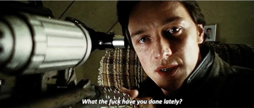 영화 '원티드'를 보신 분들이 있을지 모르겠다. 내가 글에 자주 쓰는 아래 이미지가 영화 '원티드'에서 나온 장면인데, 매우 좋아하는 대사가 나온다. 주인공은 관객들을 쳐다보며 이렇게 말한다. "What the f*** have you done lately?" 마치 나에게 물어보는 것 같아서 정신이 번쩍 든다.