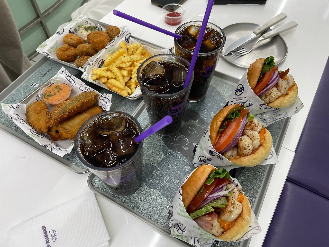 음식을 받아보니, 깔끔한 플레이팅이 마음에 들었다. 일일이 구워서 만든 듯한 햄버거와 사이드 메뉴가 정성 있었다. 구운 새우가 들어간 햄버거였는데, 직접 구운 불향이 좋았다. 새우가 크고 통통하다.