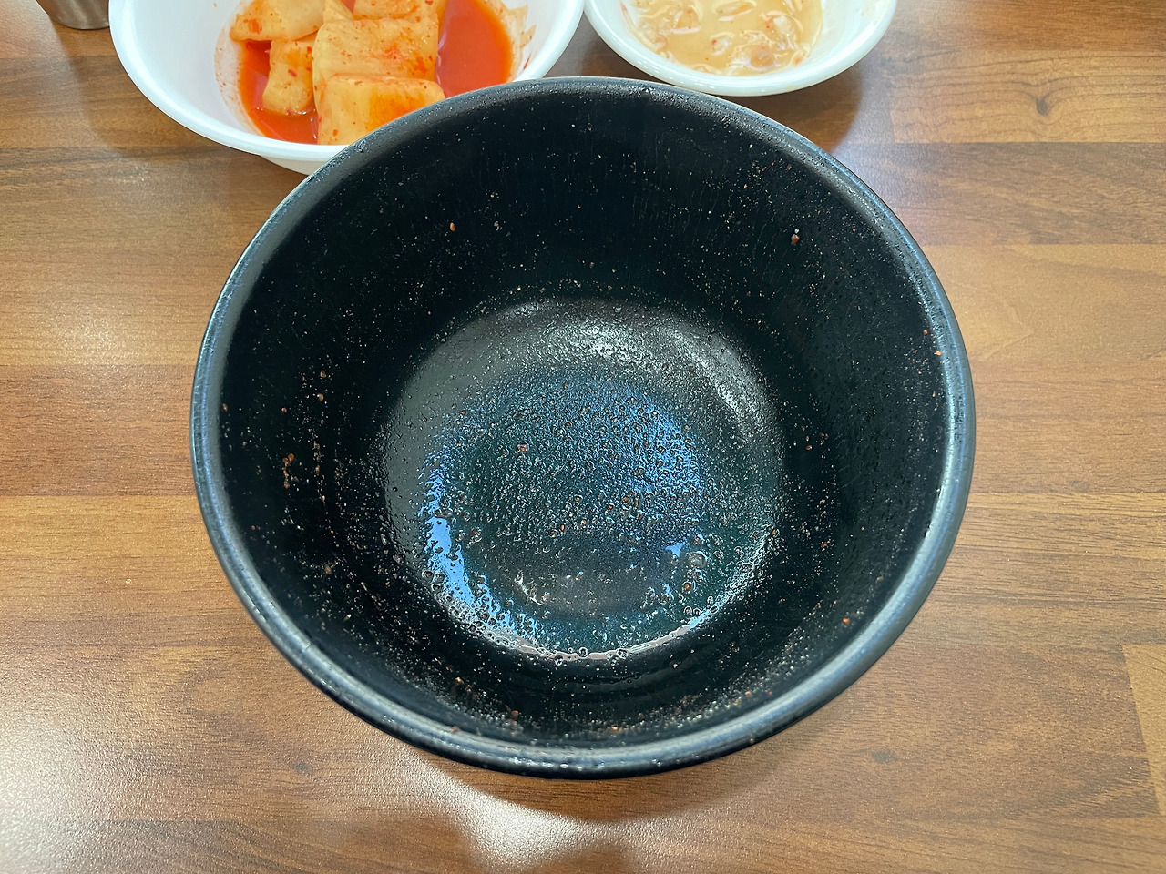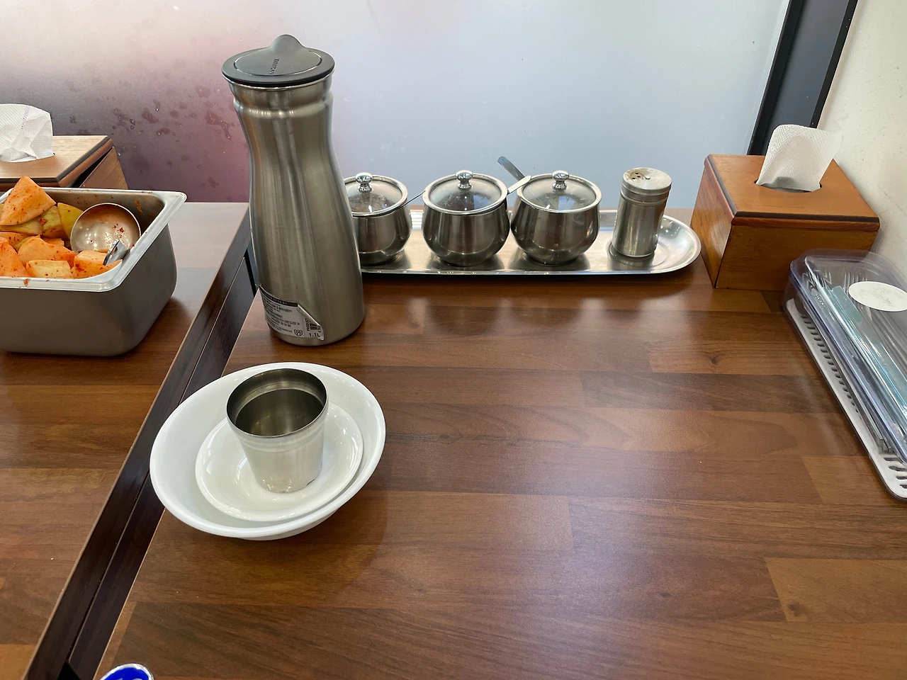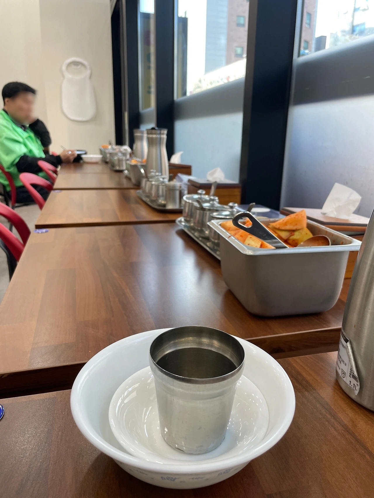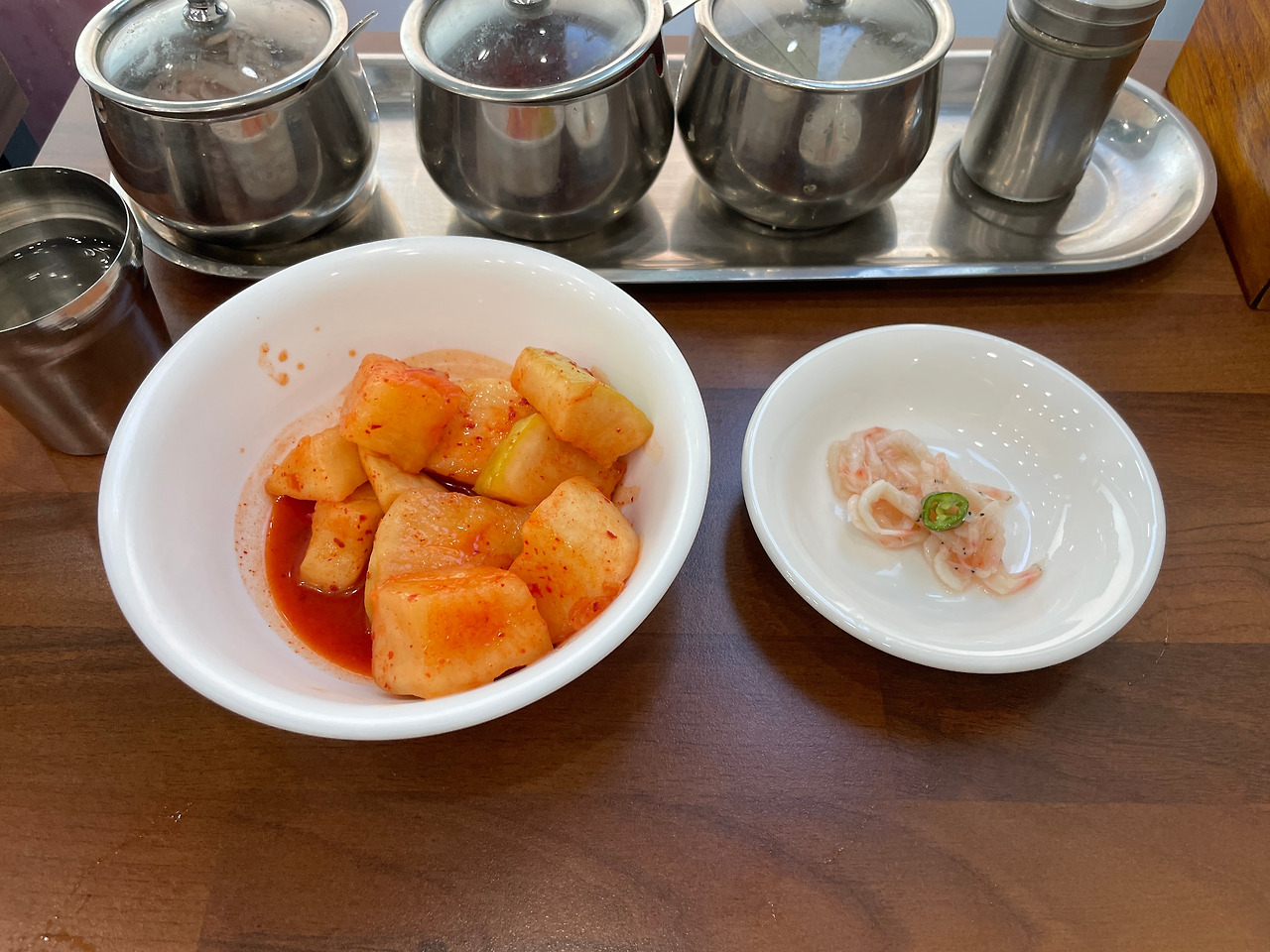 밑반찬은 별거 없다. 깍두기는 직접 테이블 위 통에서 퍼담으면 되고, 새우젓도 앞 작은통에서 적당히 덜어담으면 된다.