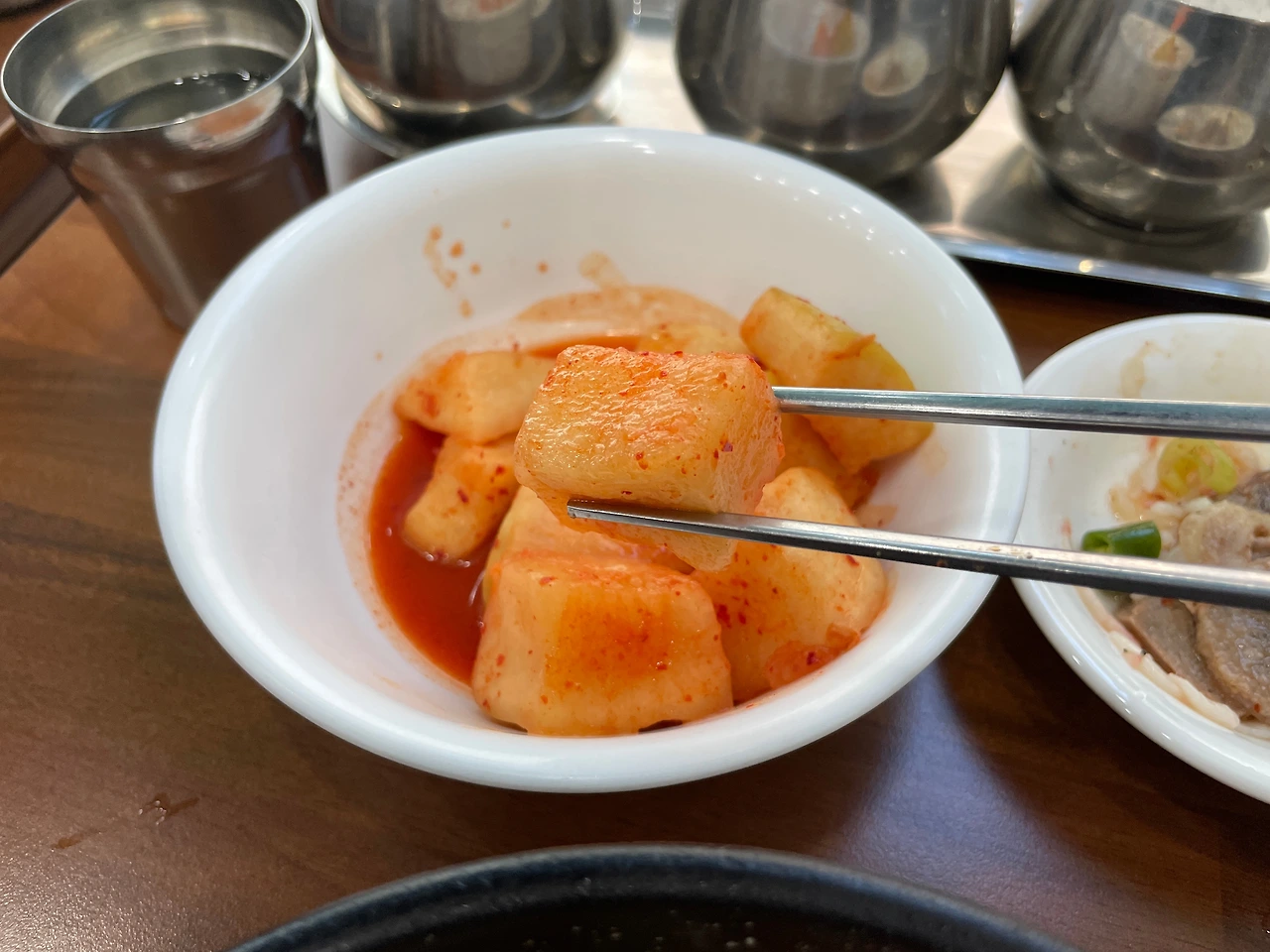 깍두기 아삭아삭 새콤쪽이다. 달콤하기도 하고. 큼직큼직해서 좋다.