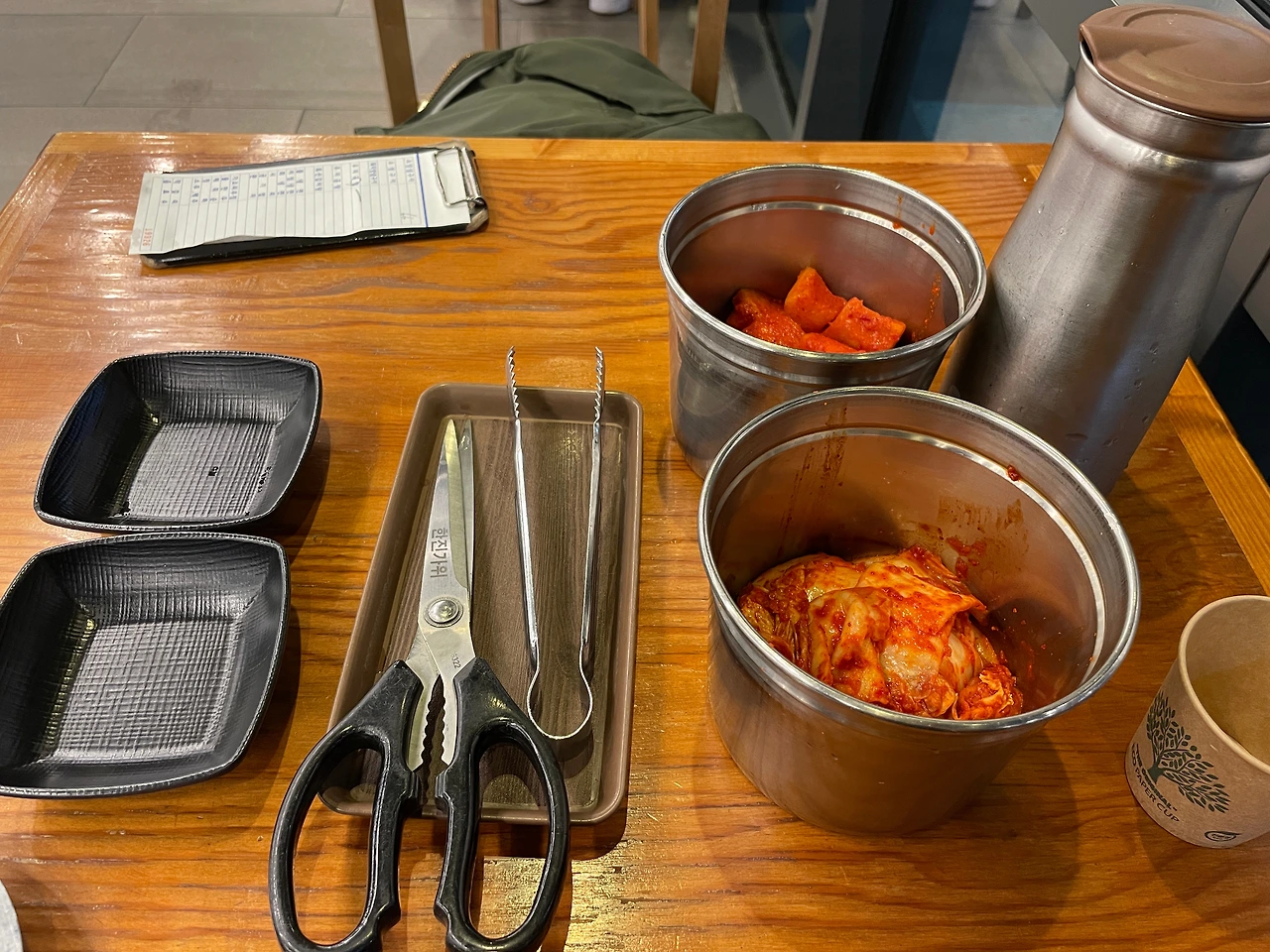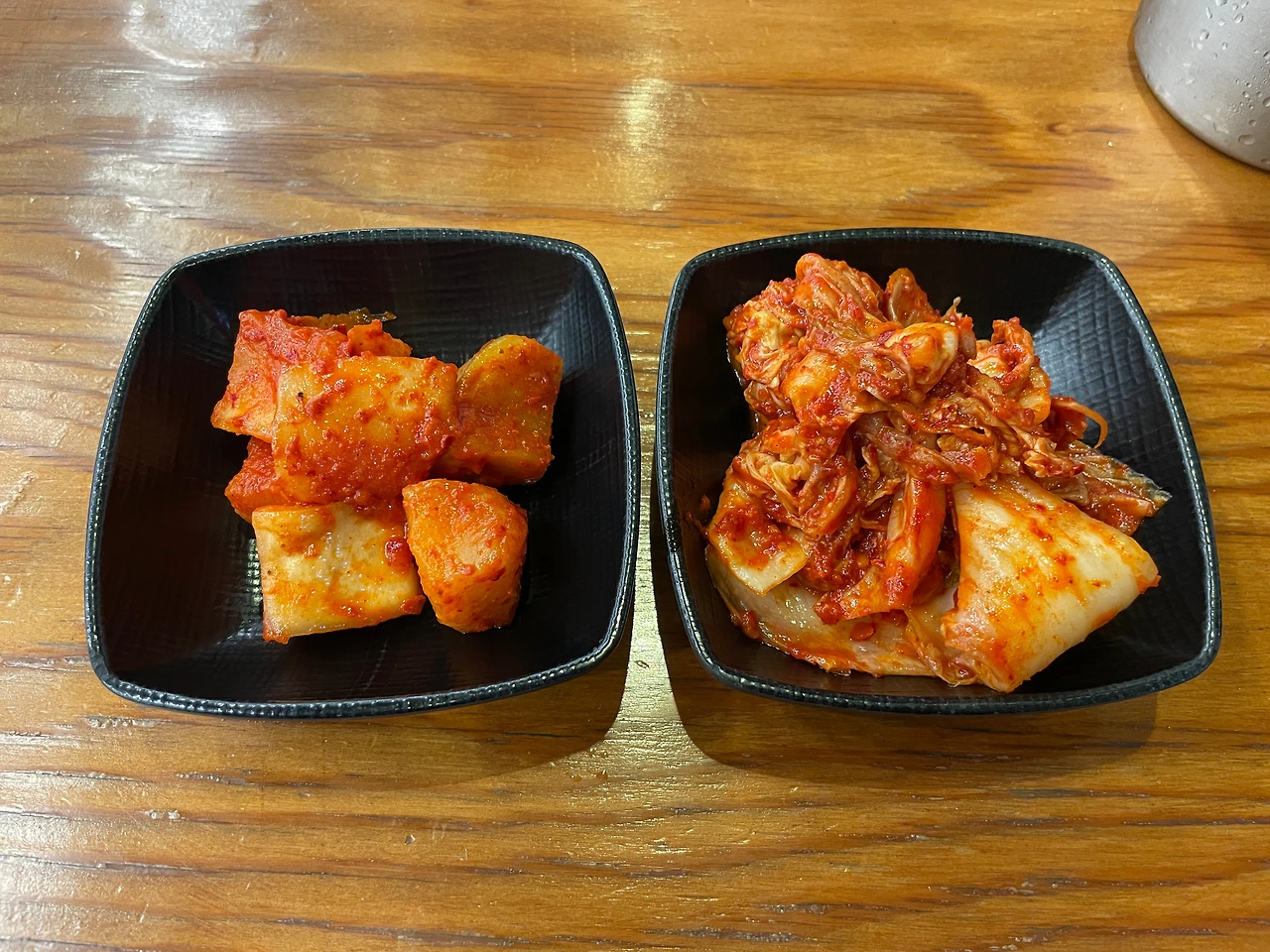 김치, 깍두기를 접시에 덜었다. 김치는 매콤 달콤 쪽이다. 안 맵고 달달한 버전의 명동칼국수 김치 느낌. 배추가 질기면 맛없는데, 여기 약간 질기다. 깍두기는 새콤 쪽이다. 달지 않다.