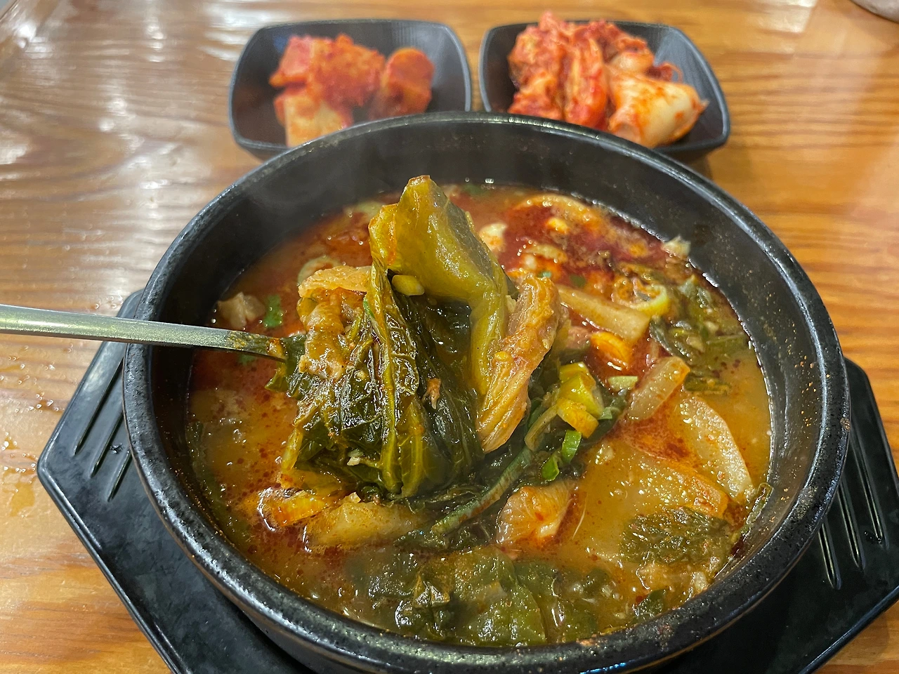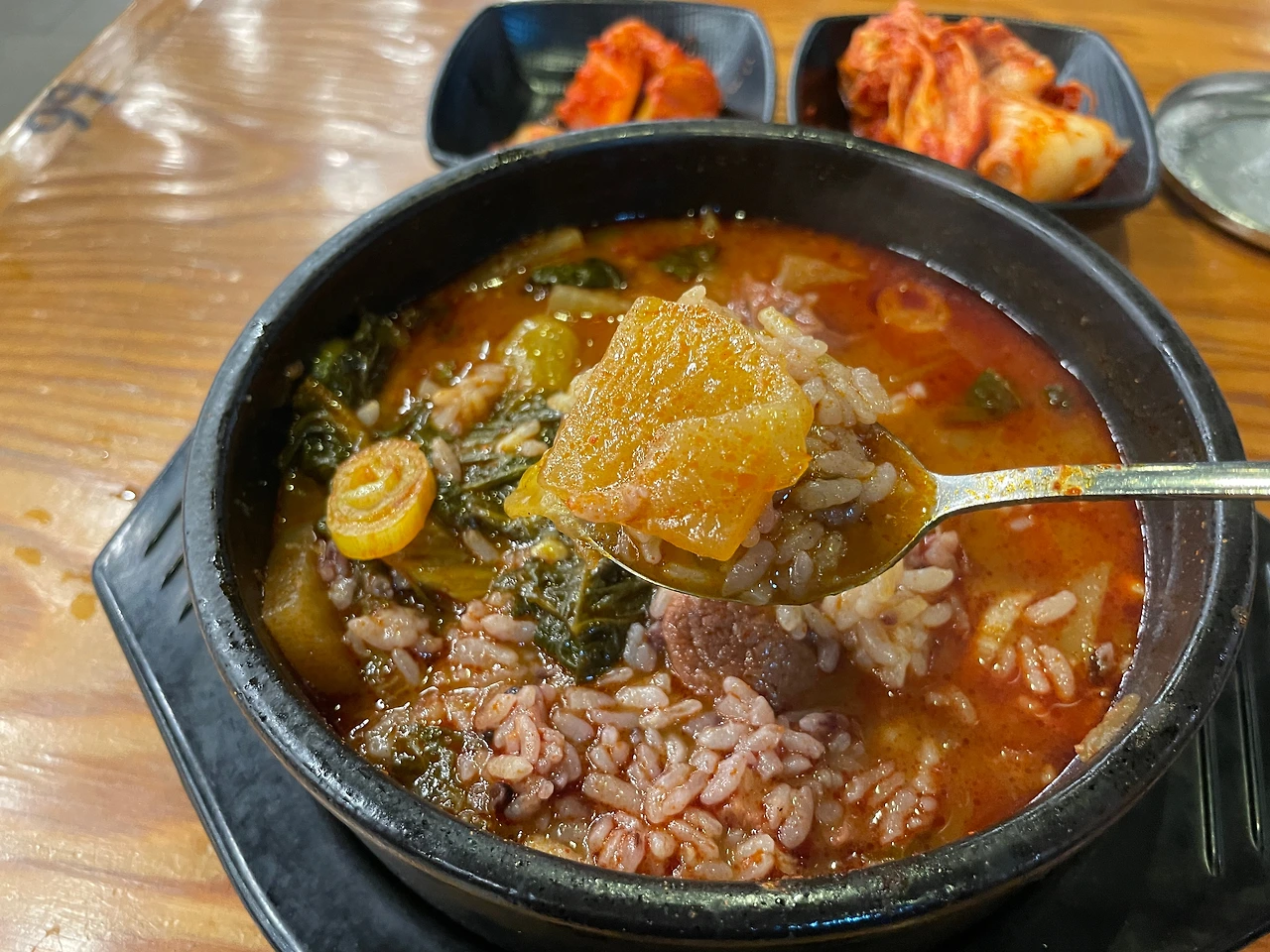 보기보다 엄청 뜨겁다. 게다가 좀 많이 맵다. 맵고 뜨겁고 난리 났네. 나는 매운 걸 잘 못 먹는데. 김치가 달아서 같이 먹으니 조금 중화시켜 준다.