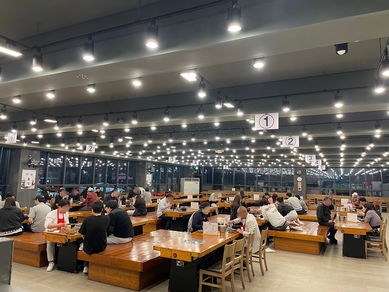 입장. 실내가 넓다. 낮엔 여기가 꽉 찬다니 어마어마한 규모다. 반도체 조립라인 같기도 하고. 강한 조명 때문인지, 마치 거대 국밥 공장 같은 분위기다.