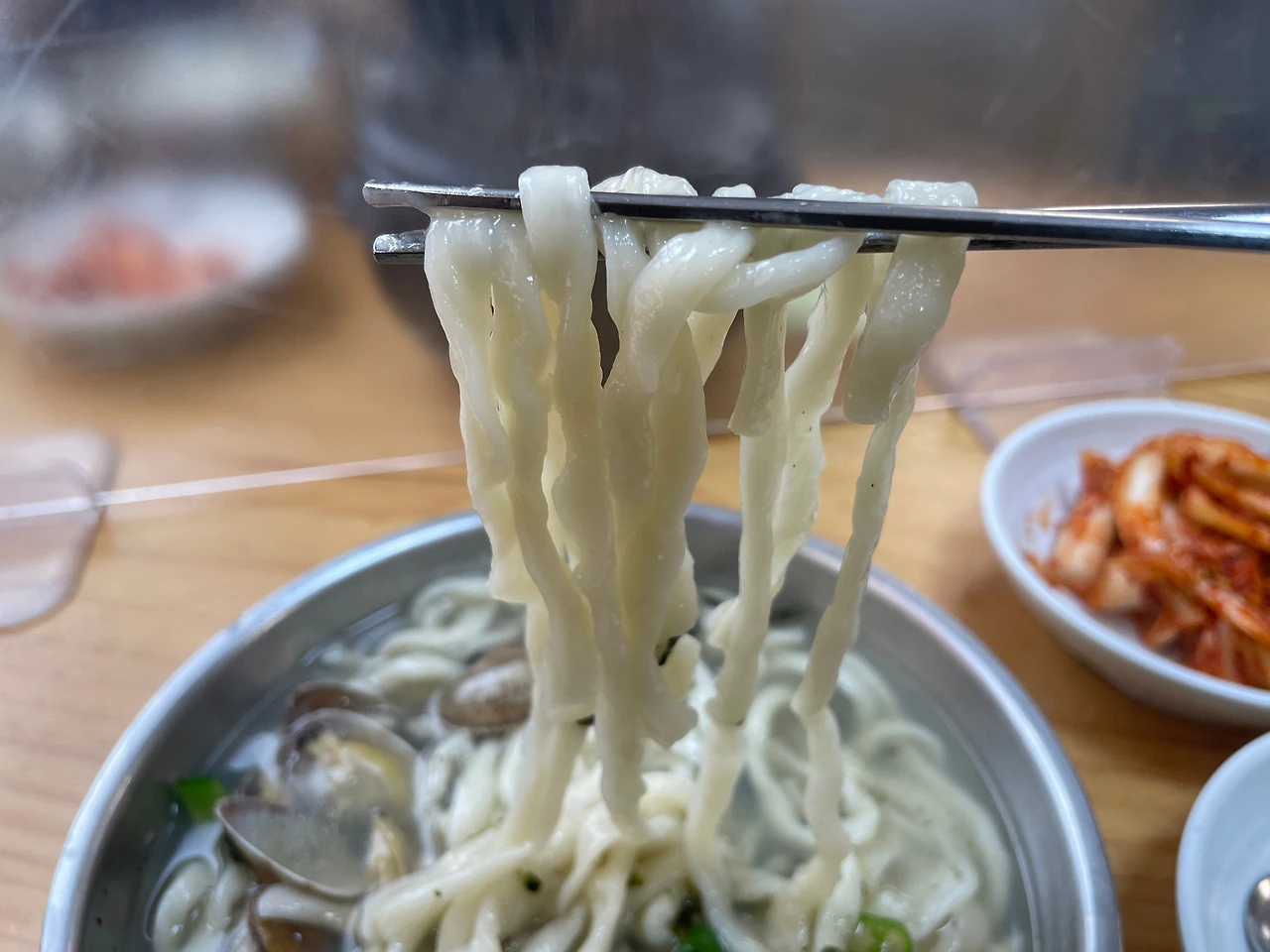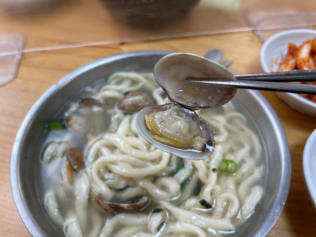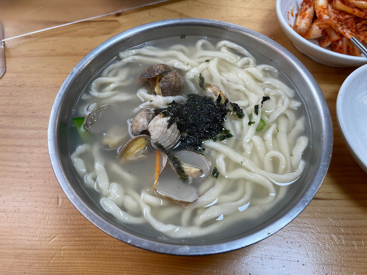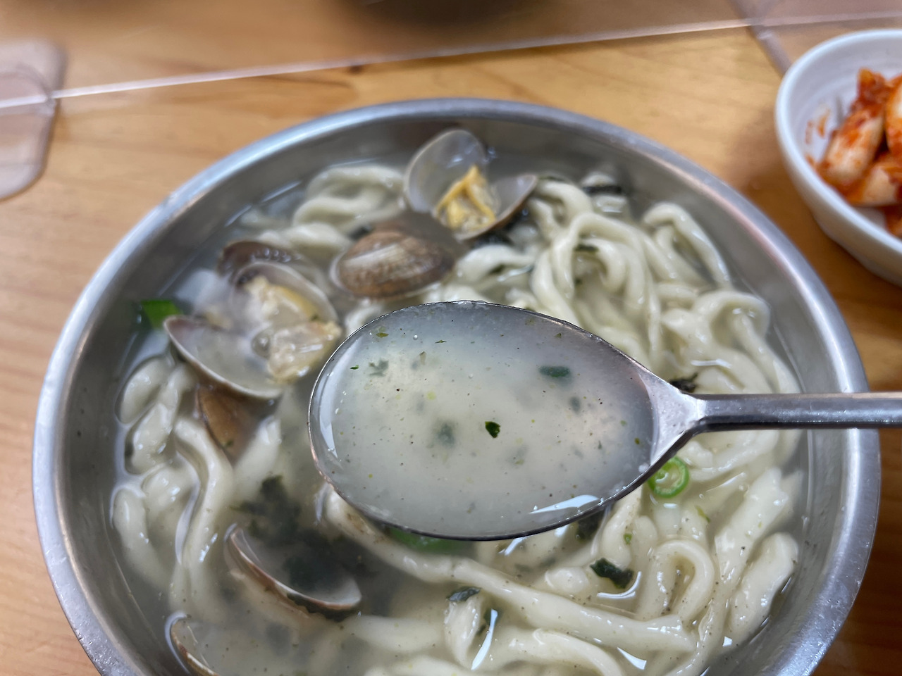 국물이 시원하다. 푹 끓인 진한 바지락 국물이다. 칼국수의 전분기가 배어, 살짝 걸쭉하다.