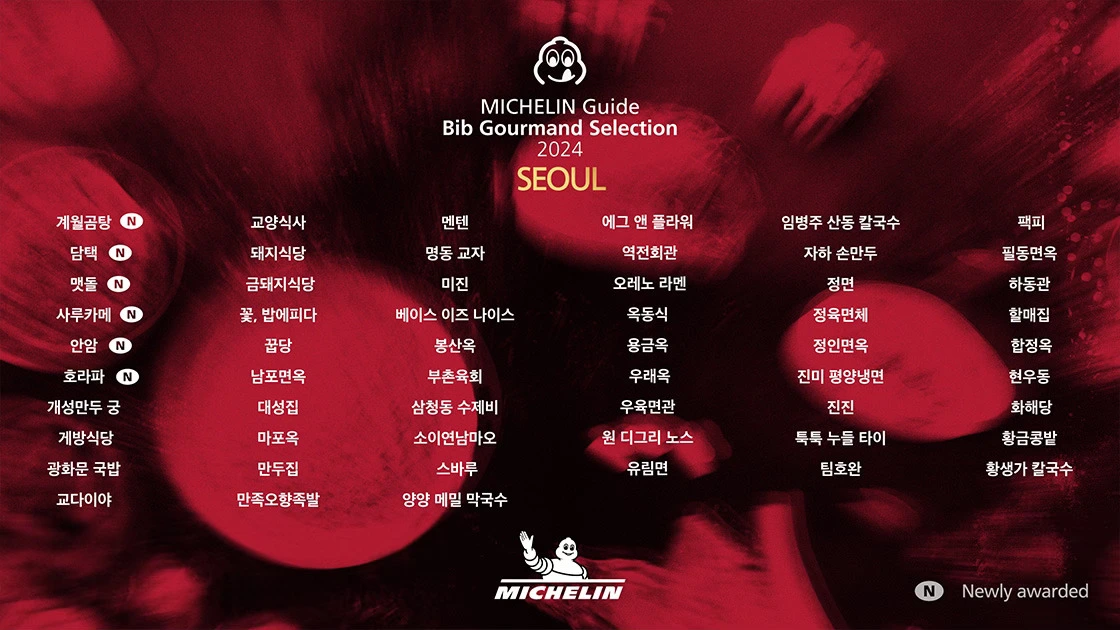 미슐랭 빕구르망 선정이 어느 정도냐면, 2024년 서울에 단, 57곳만 선정되었다. 서울의 수많은 음식점들 중 57개의 가게란 말이다. 대단한 일이다. 2024년 미슐렝 빕구르망 선정 식당은 아래와 같다. 명동교자, 유림면, 만족오향족발, 진미 평양냉면, 하동관 등등 친숙한 가게들이 많다. 갑자기 강남역 오향족발 폐점한 게 너무 아쉽네.
