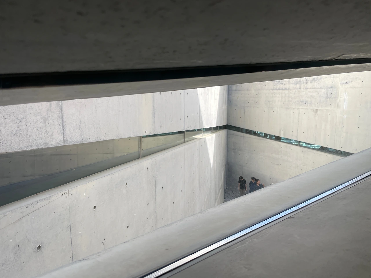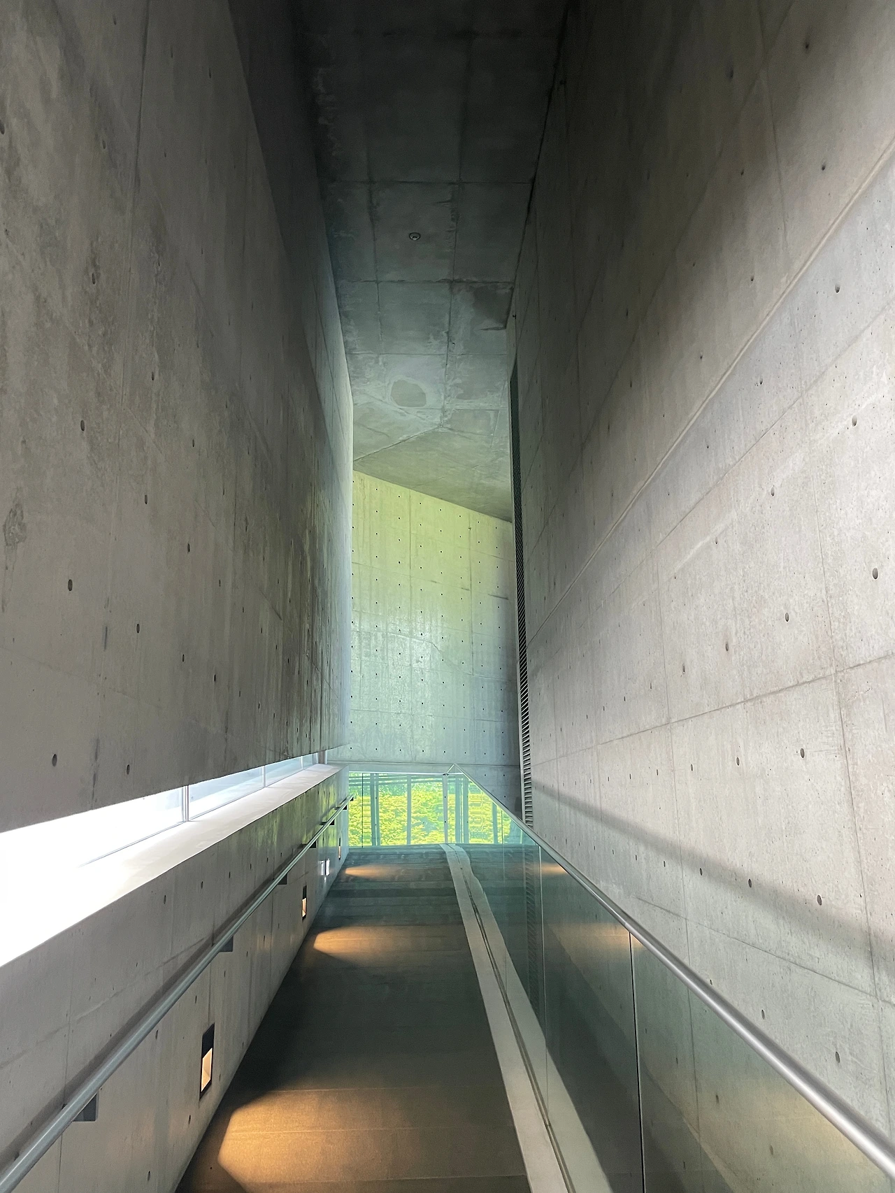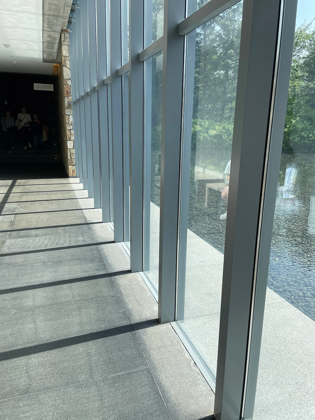 뾰족한 복도를 따라 올라가며 벽 틈으로 내다보이는 중정. 두꺼운 유리로 마감해 놨던데, 혹시 비가 들이쳐서 그런 걸까. 설계자는 이걸 원했을까. ’빛의 교회‘의 십자가도 이런 식으로 유리를 용접했던 걸로 기억한다.
