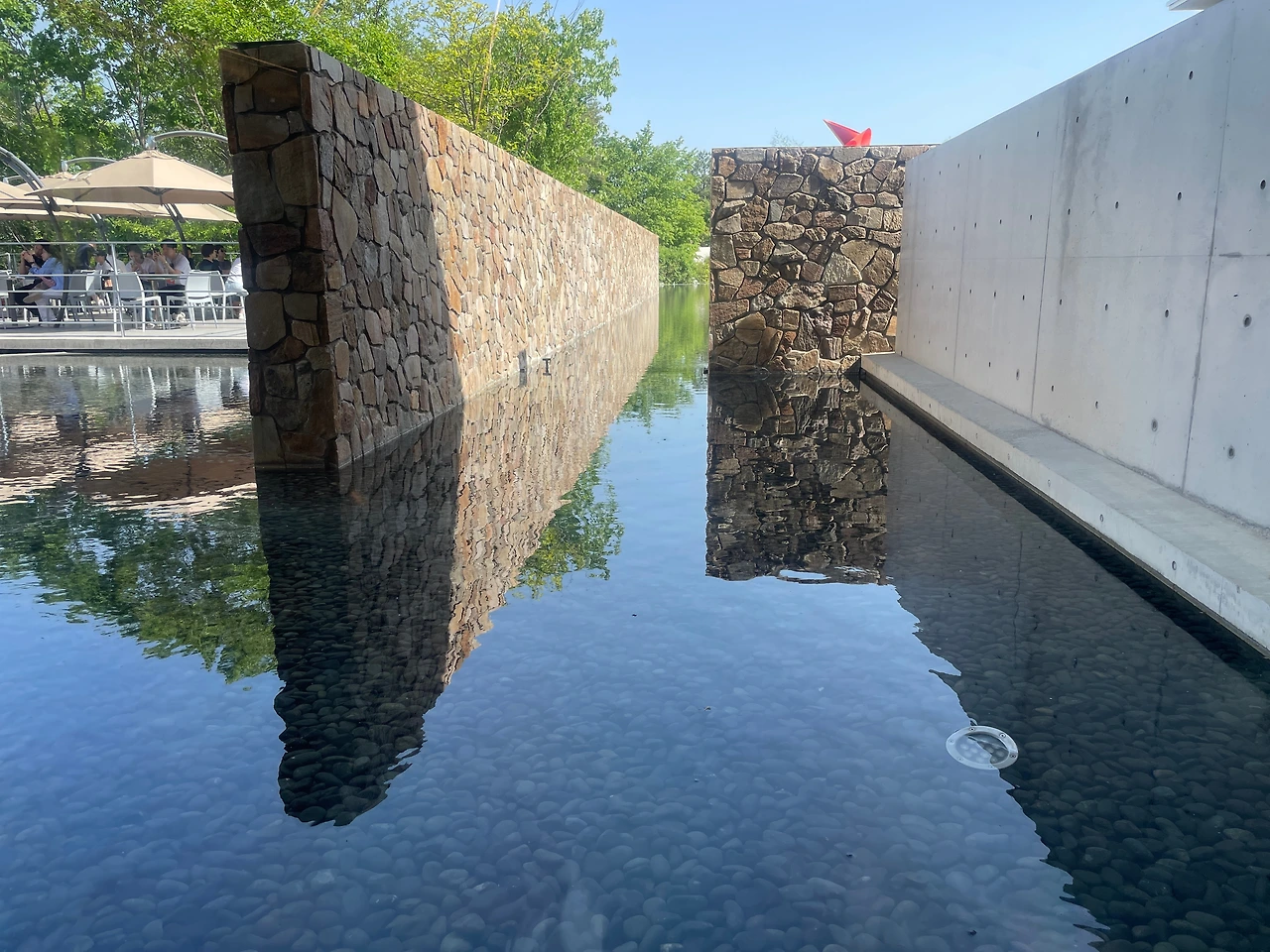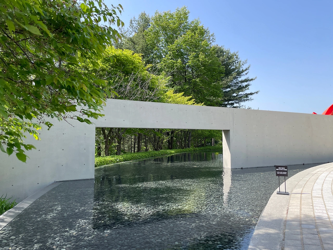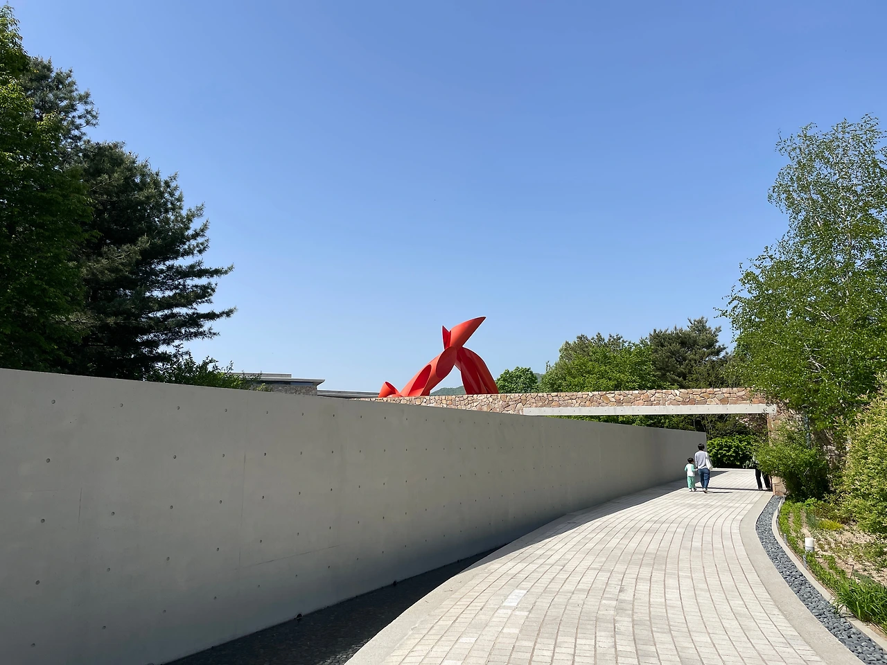 길고 낮은 콘크리트 벽이 관람객의 동선을 자연스럽게 이끈다. 그는 길고 낮은 사선의 벽을 좋아하나 보다. 저 빨간 구조물은 지나쳤다. 건축물이라고 보기 어렵구나.