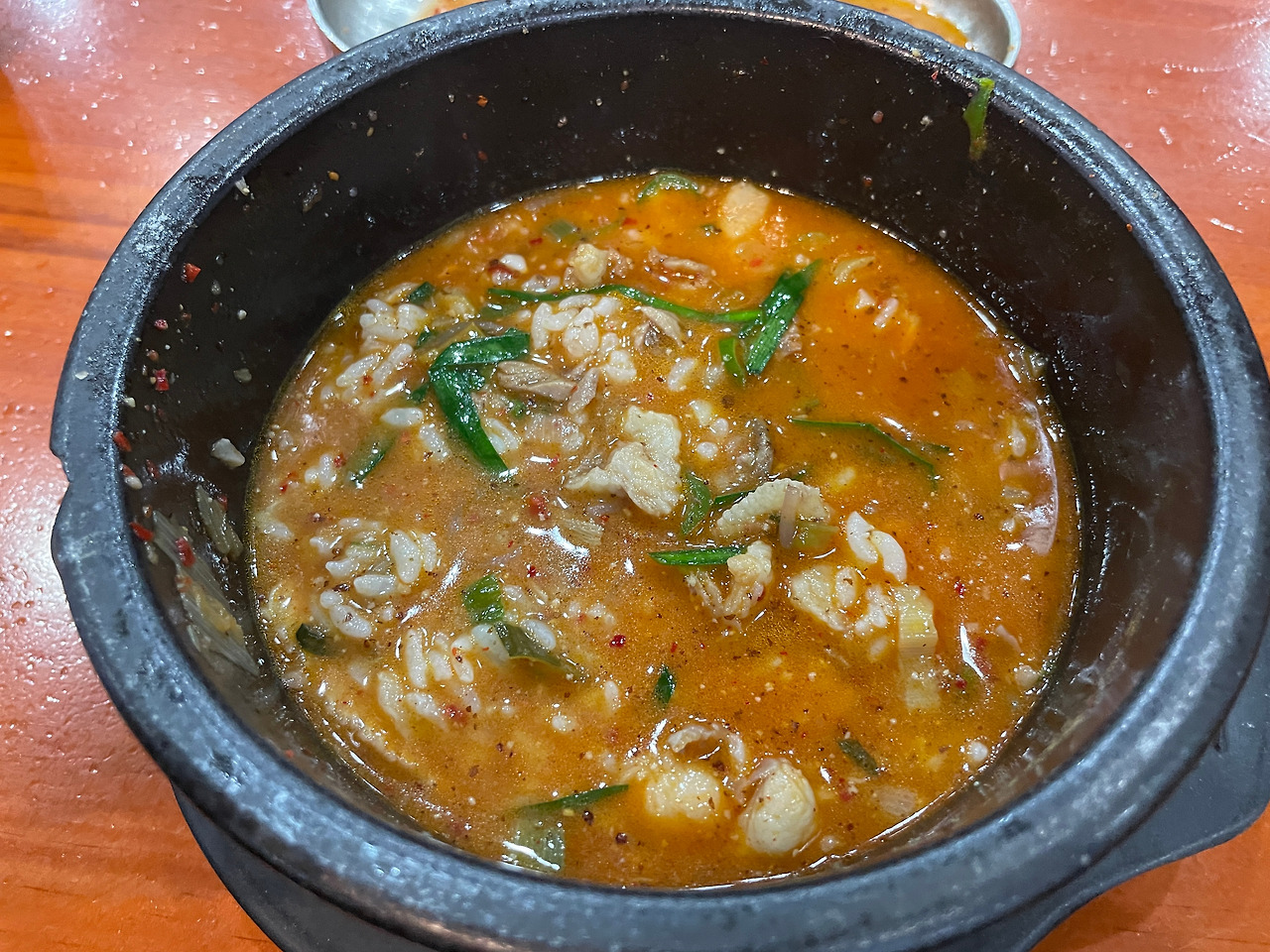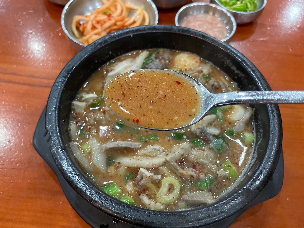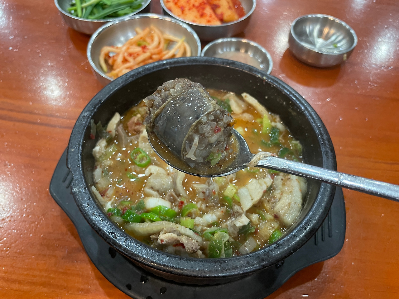 아! 이거 뼈해장국 국물 맛이잖아?! 맞다. 그래. 묘한 향과 맛은 그거였다. 맛없다는 게 아니다. 매콤하고 깊고 진한 육수 맛이 좋다. 맛있는데 독특하다. 뼈해장국과 순댓국을 동시에 즐길 수 있다니. 일타쌍피. 도랑치고 가재 잡고.