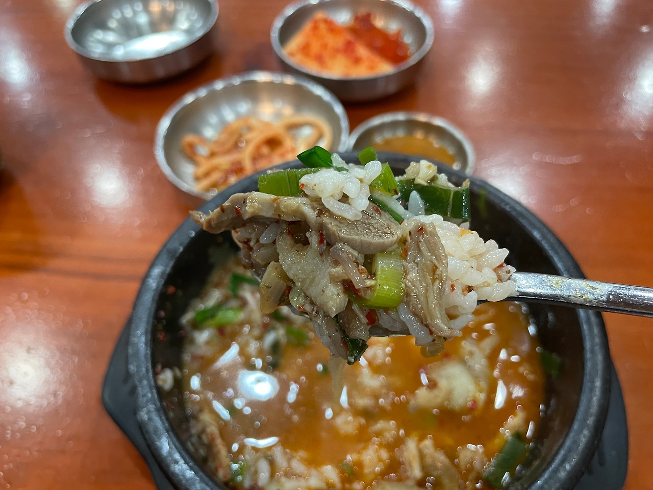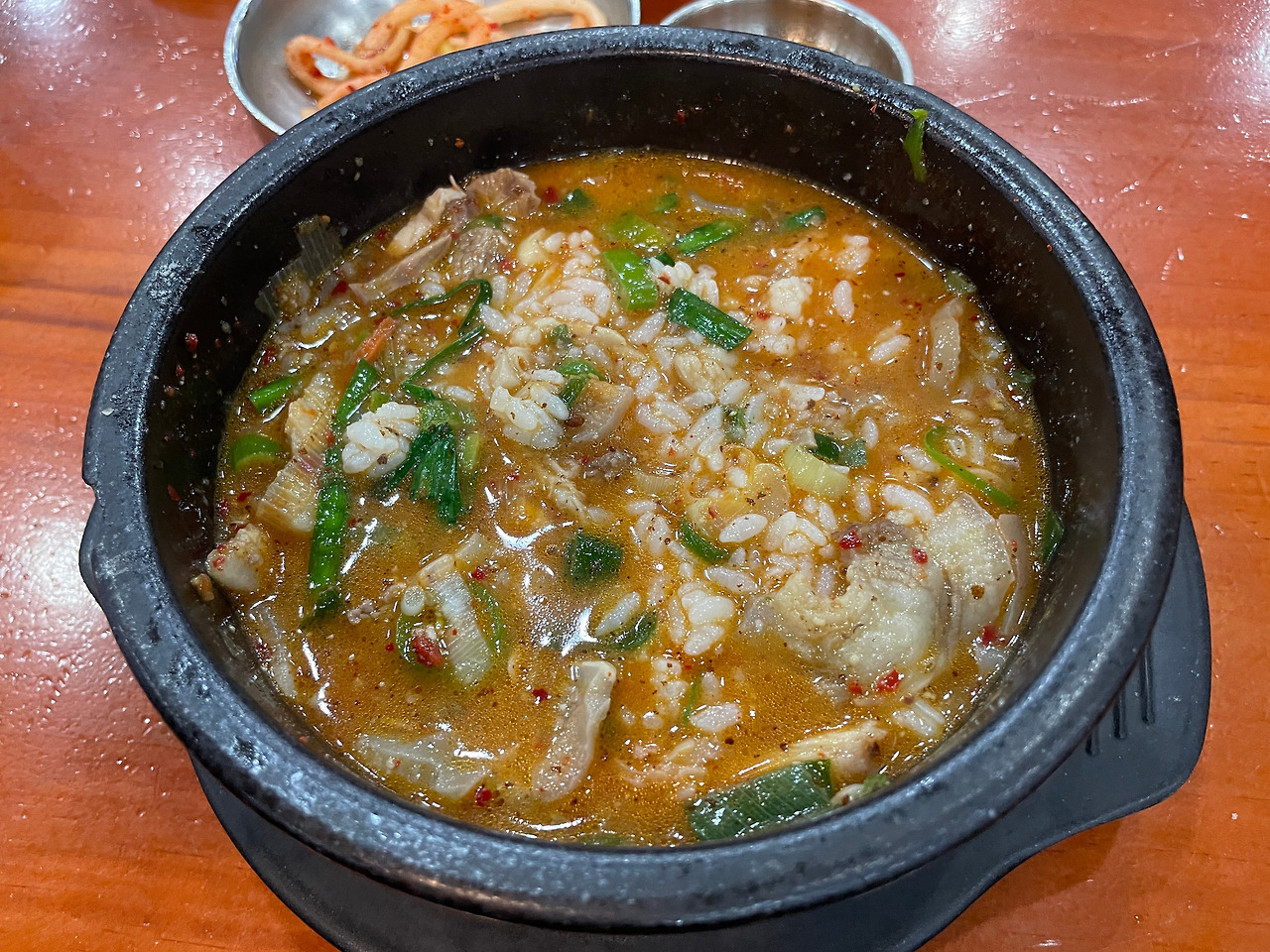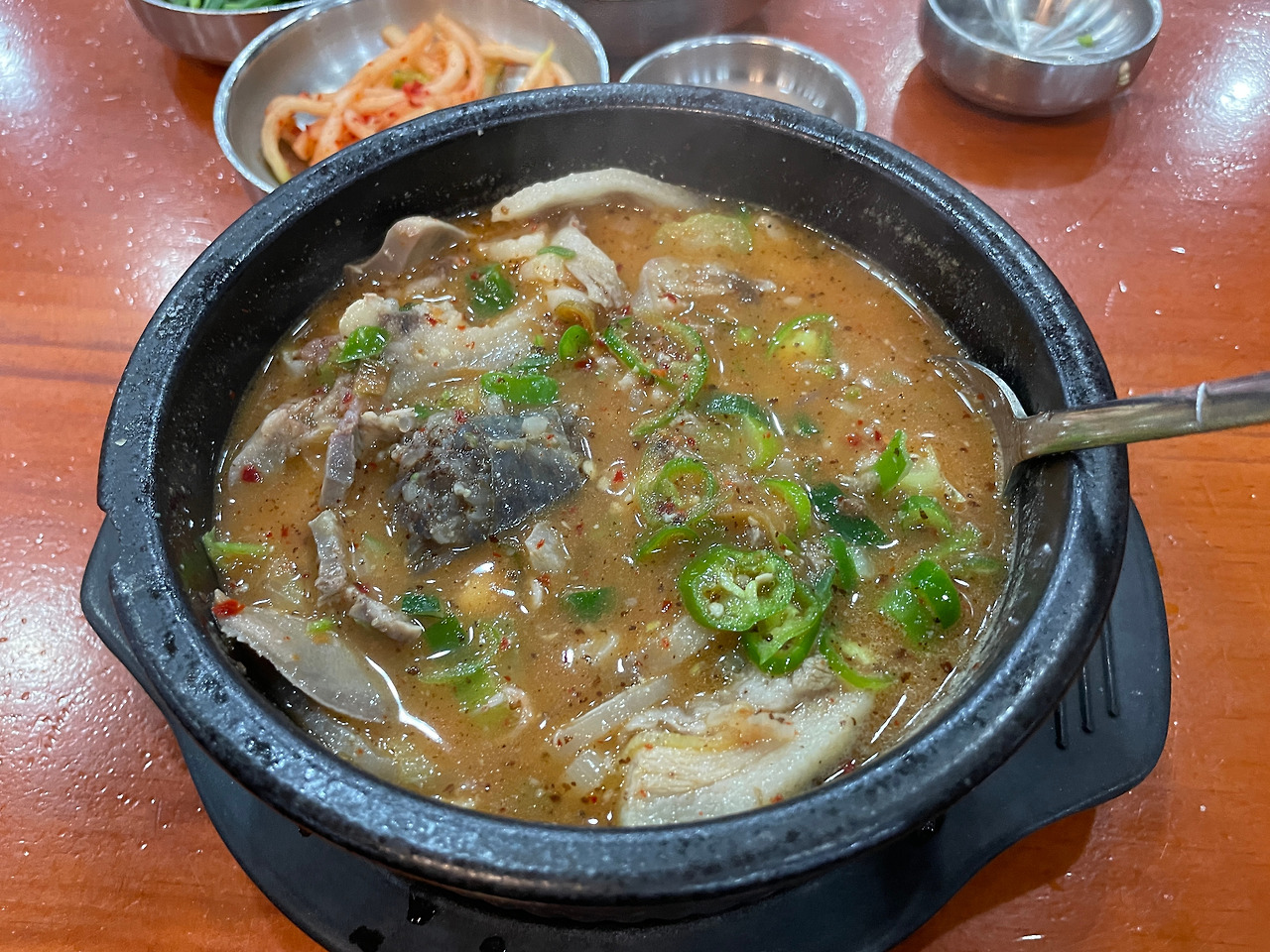아! 이거 뼈해장국 국물 맛이잖아?! 맞다. 그래. 묘한 향과 맛은 그거였다. 맛없다는 게 아니다. 매콤하고 깊고 진한 육수 맛이 좋다. 맛있는데 독특하다. 뼈해장국과 순댓국을 동시에 즐길 수 있다니. 일타쌍피. 도랑치고 가재 잡고.