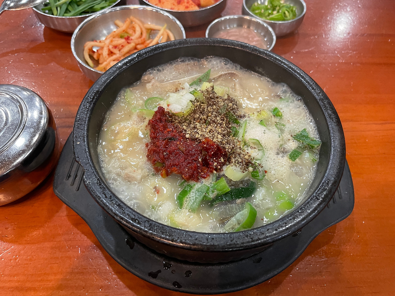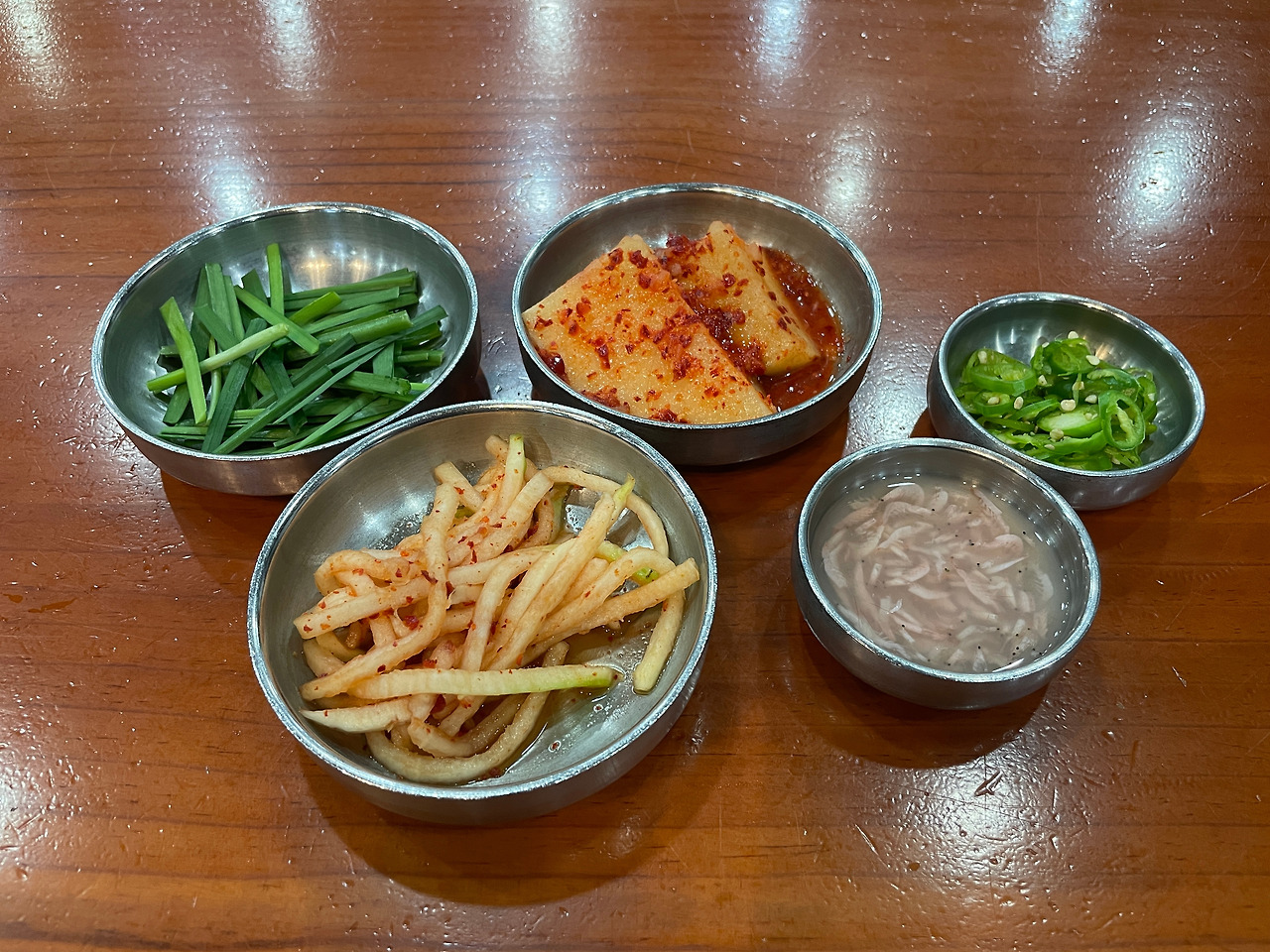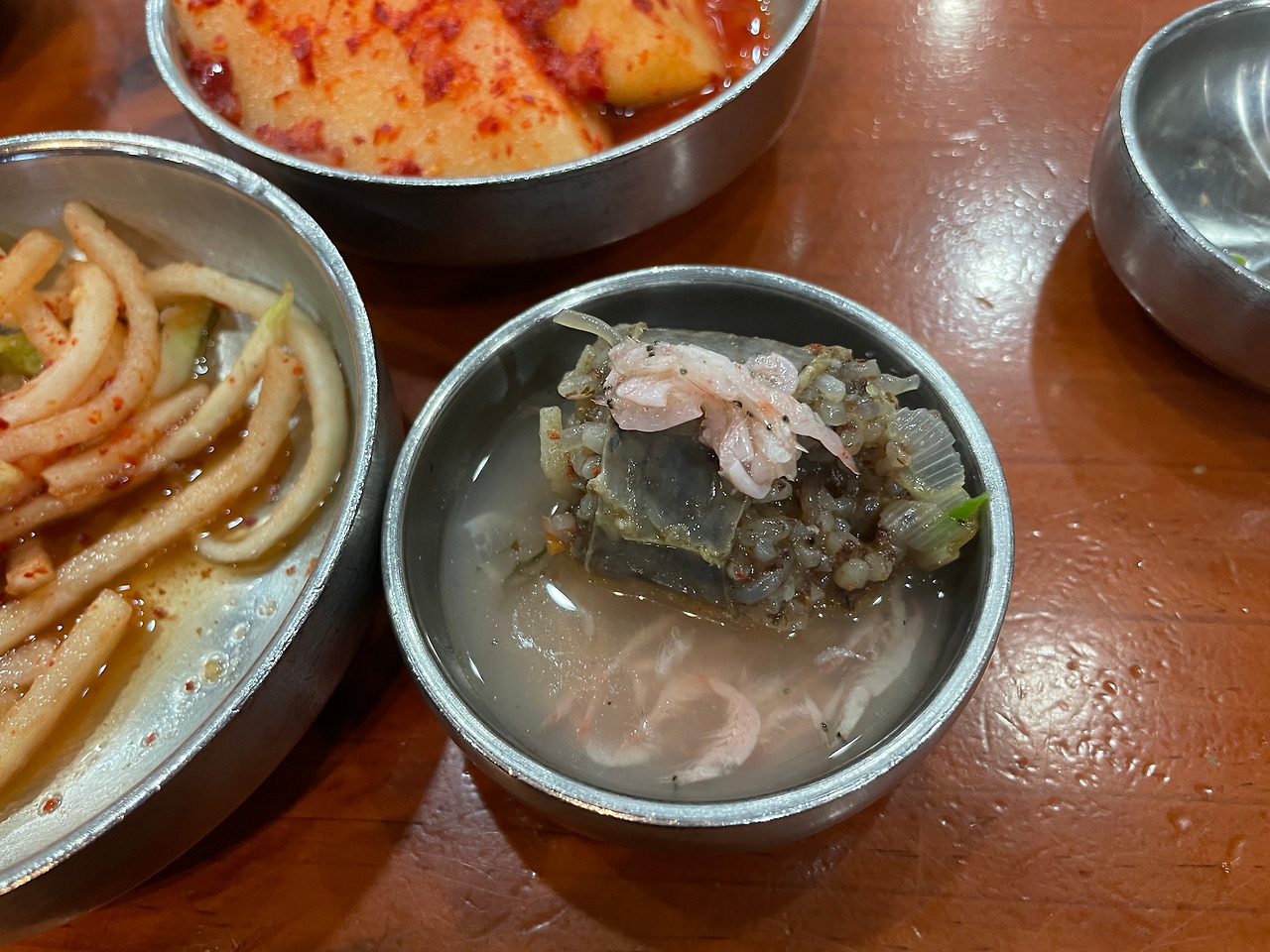 밑반찬. 기본 구성이다. 다른 테이블은 고추를 주던데, 나는 안주더라. 추가금 같은 게 있는 건가. 고추 그거 뭐 별로 안 좋아한다. 안 먹어도 됨.(달라고 말 못 하는 성격이라 그런 거 절대 아님)