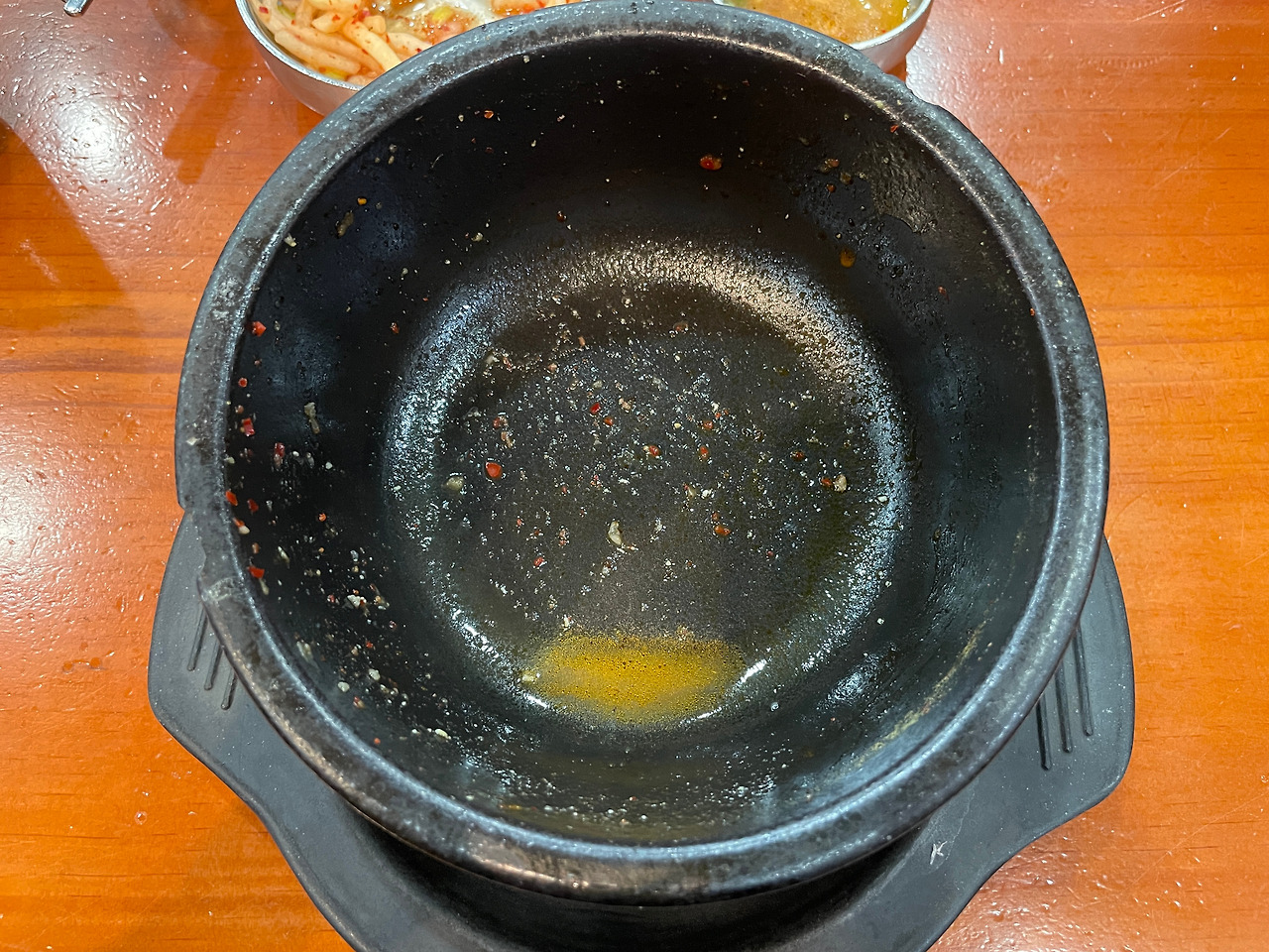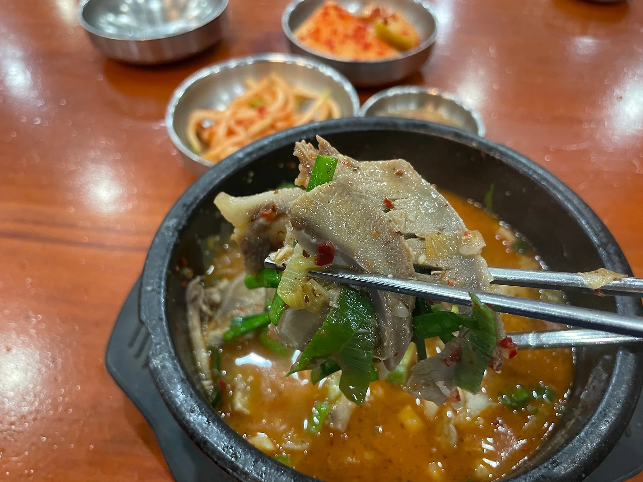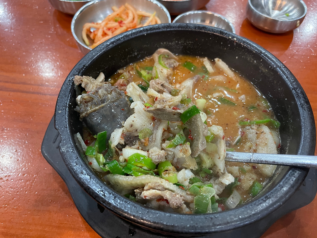 밑반찬. 기본 구성이다. 다른 테이블은 고추를 주던데, 나는 안주더라. 추가금 같은 게 있는 건가. 고추 그거 뭐 별로 안 좋아한다. 안 먹어도 됨.(달라고 말 못 하는 성격이라 그런 거 절대 아님)