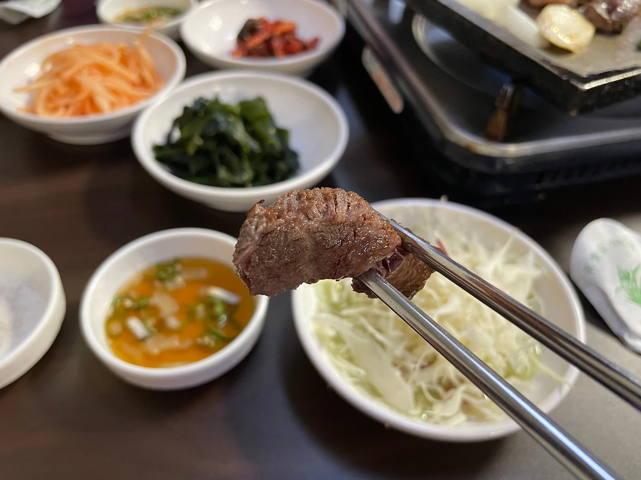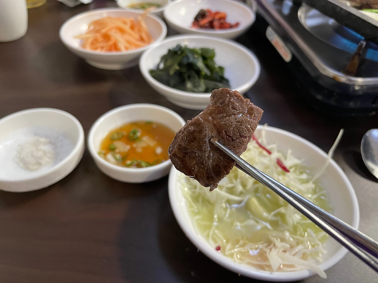 소금만 찍어서 먹는다. 좋은 고기엔 이런저런 양념 필요 없다. 소금이면 충분하다.