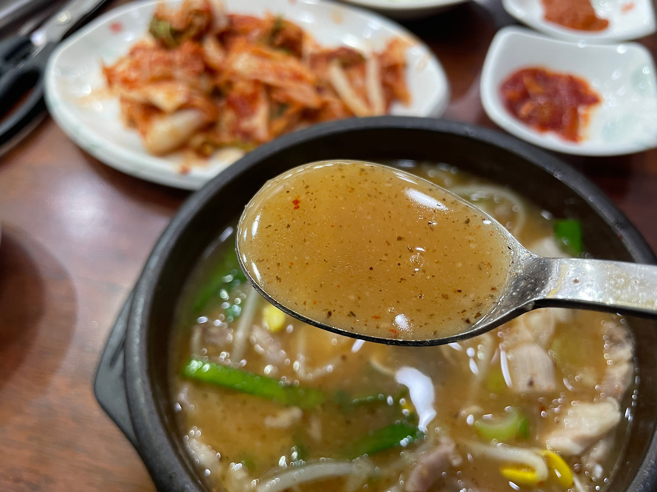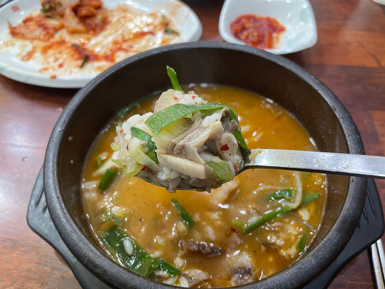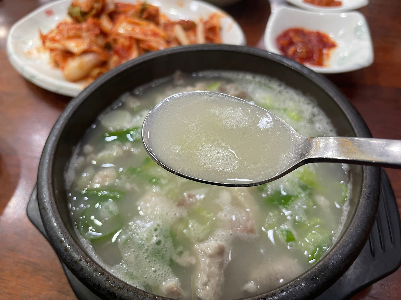딱 세 숟가락만 밥에 김치를 먹었다. 여기서 멈춰야 한다. 흰밥에 겉절이는 역시 최고의 조합이다. 더 먹으면 배불러서 순댓국 맛을 보기 힘드니, 이제 본격적으로 순댓국에 집중해 보자.