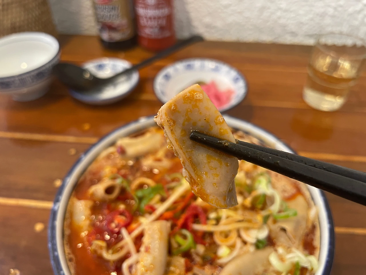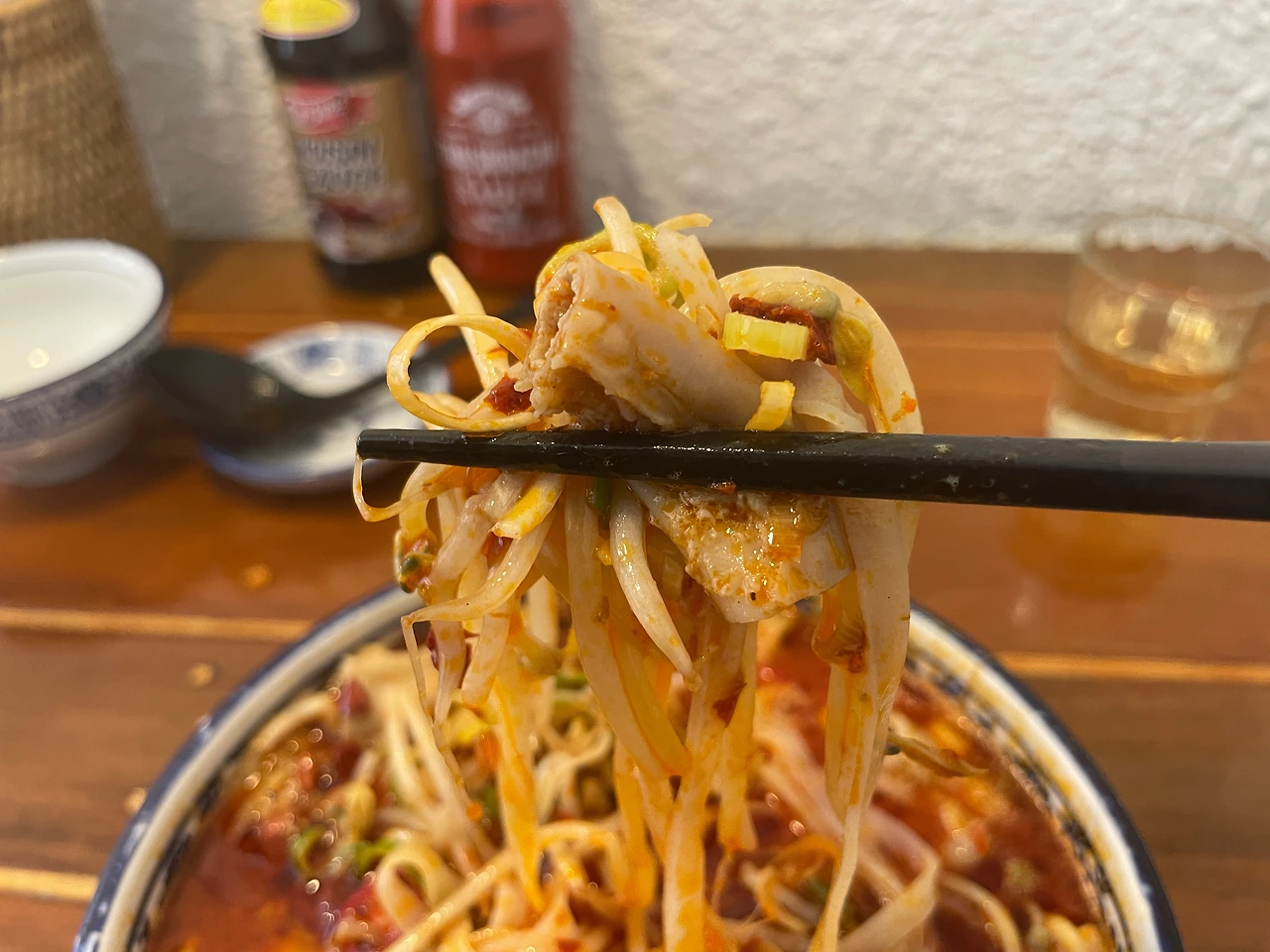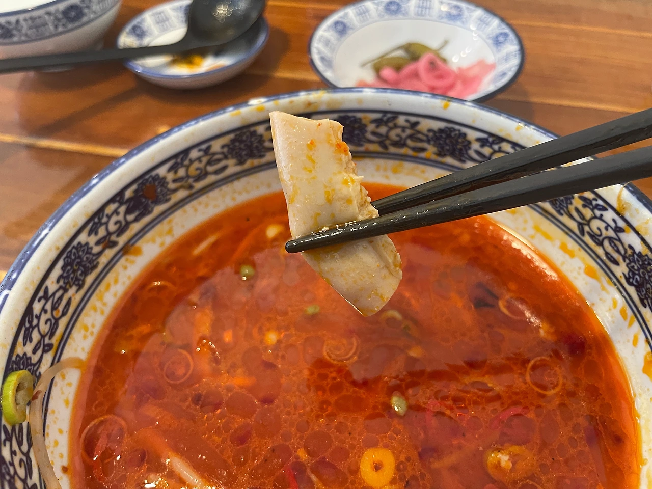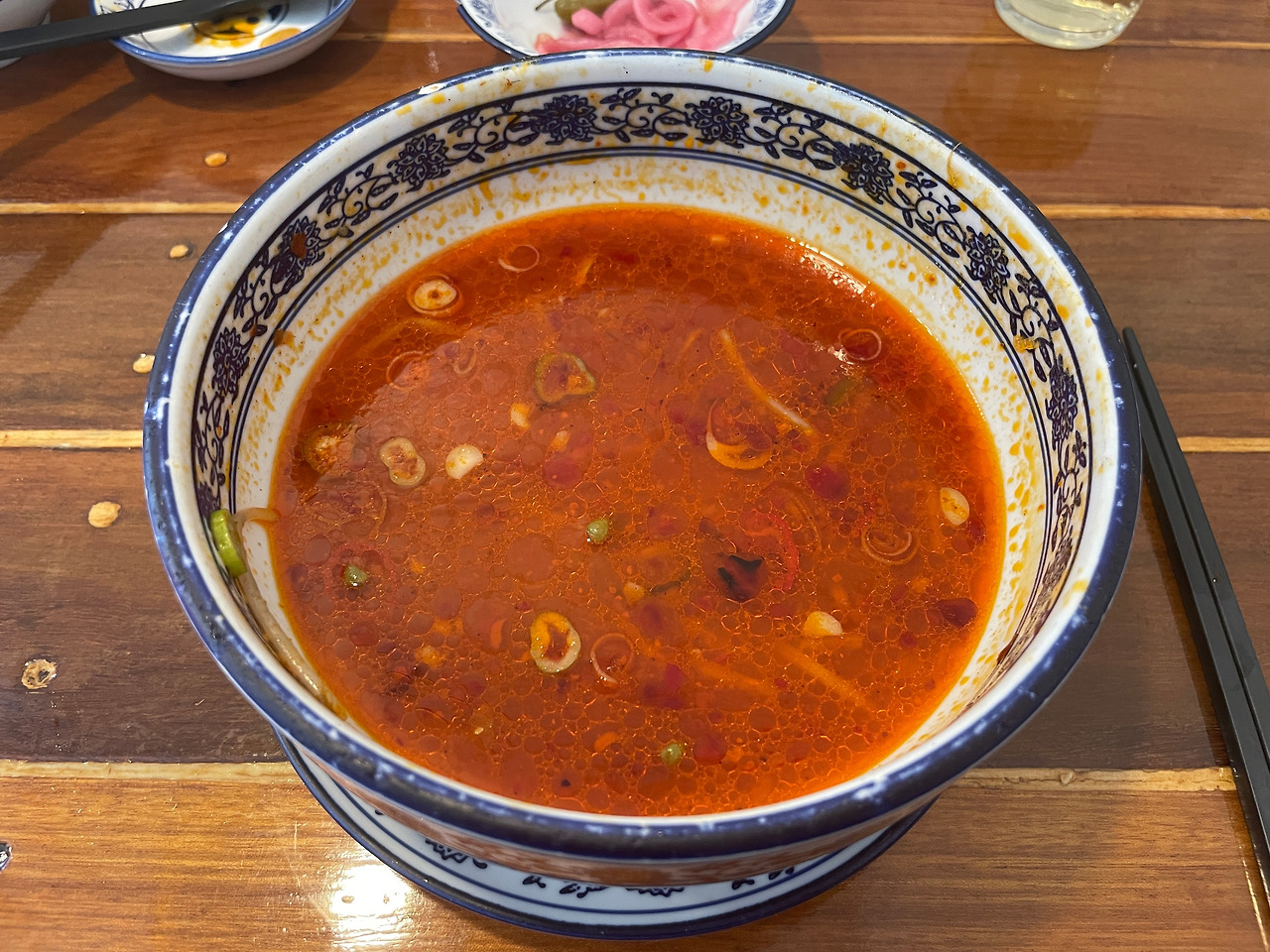 국물은 마라에서 오는 얼얼한 매운맛이 아니라, 고추 자체에서 나오는 깔끔한 매콤함에 가깝다. 국물에 기름기가 많다. 아무래도 곱창이 기름지니 그럴 수밖에.