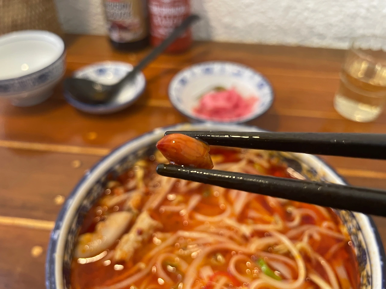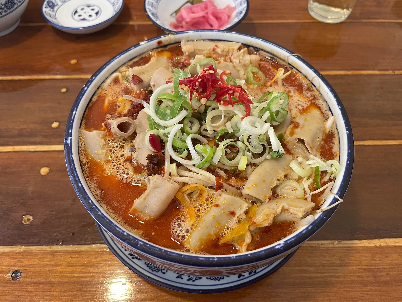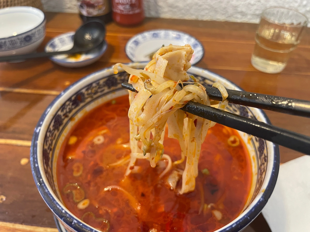 국물은 마라에서 오는 얼얼한 매운맛이 아니라, 고추 자체에서 나오는 깔끔한 매콤함에 가깝다. 국물에 기름기가 많다. 아무래도 곱창이 기름지니 그럴 수밖에.