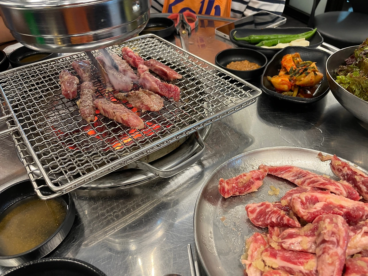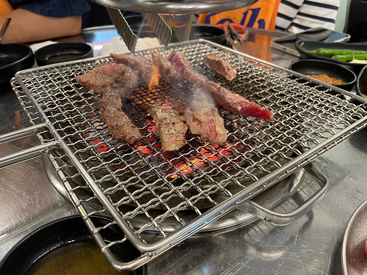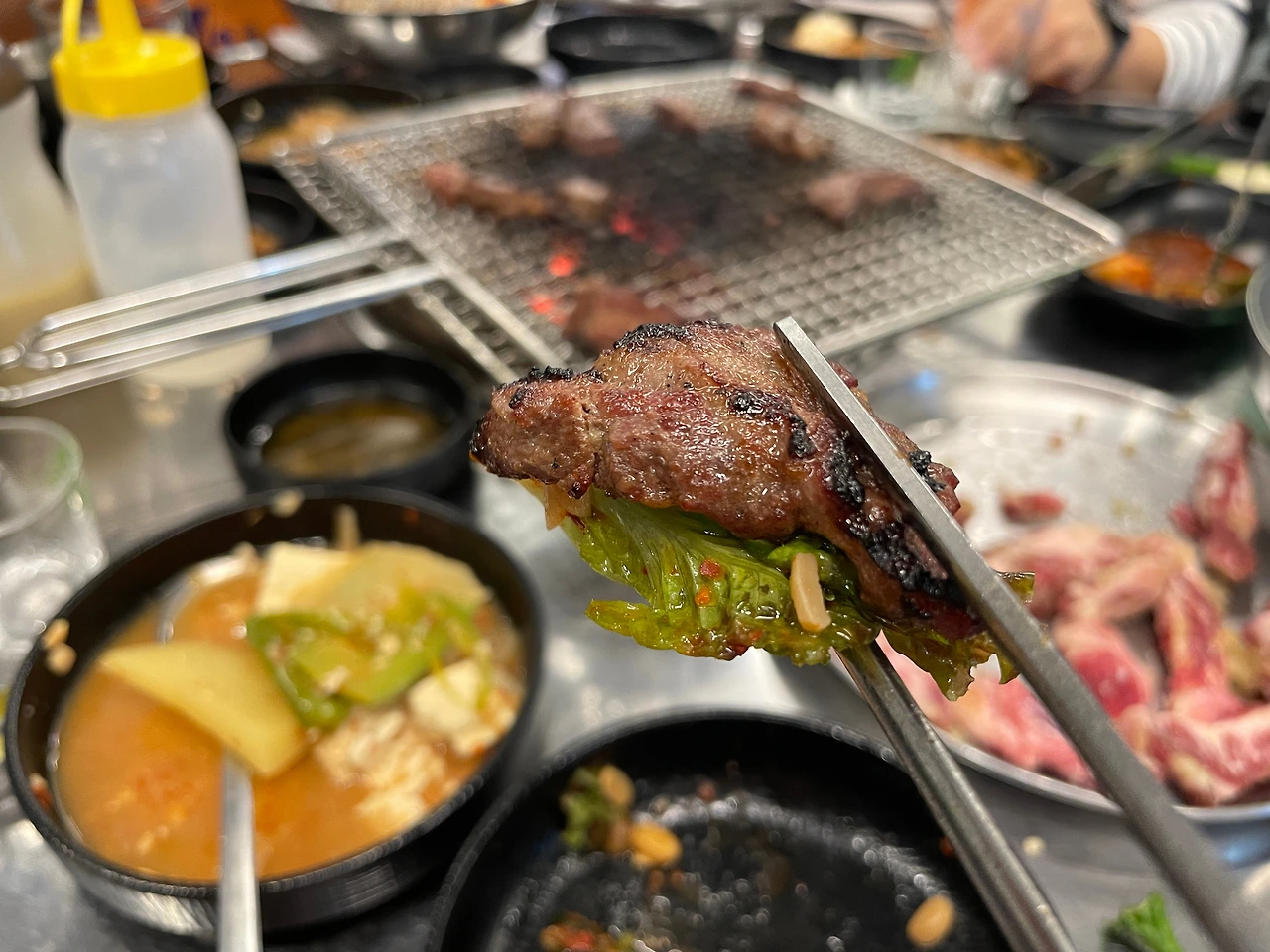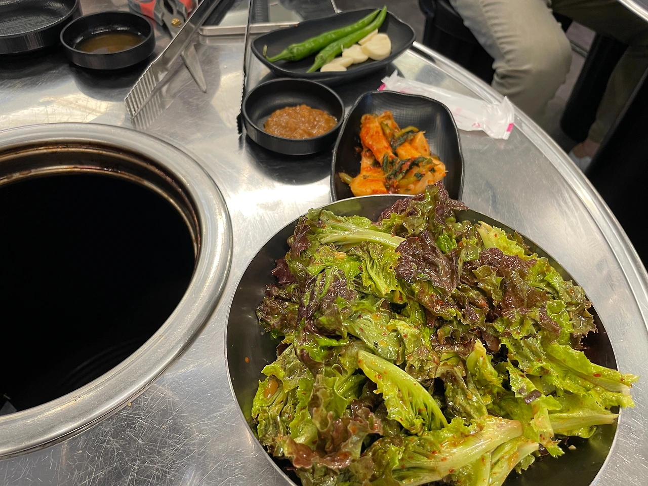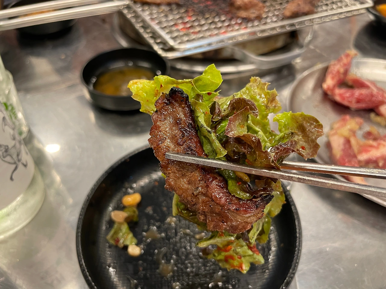 고기는 다진 마늘에 소금 등으로 양념이 되어 있다. 우리가 상상 가능한 바로 그 맛이다. 상추 무침과 같이 먹으면 기가 막힌다.