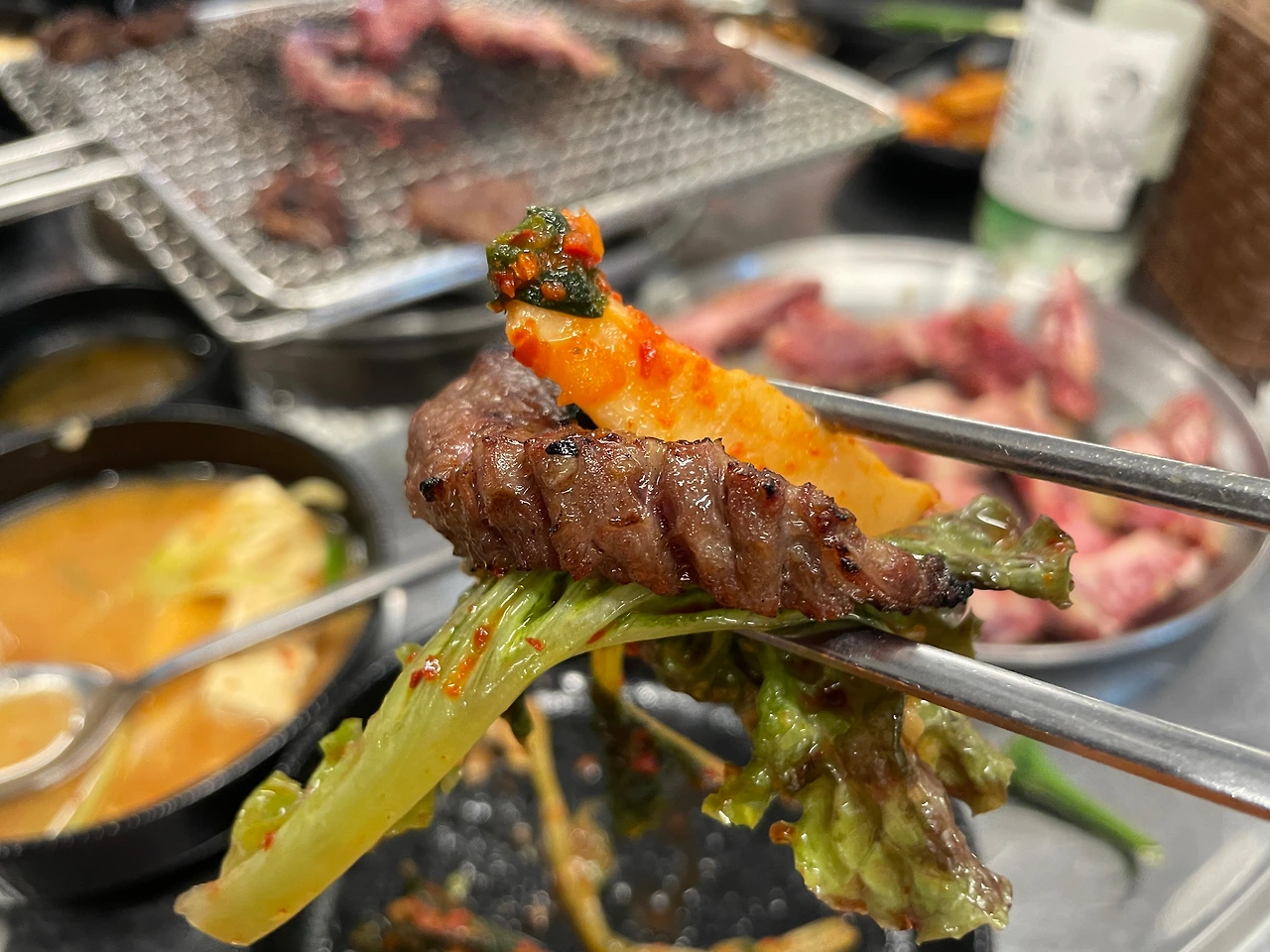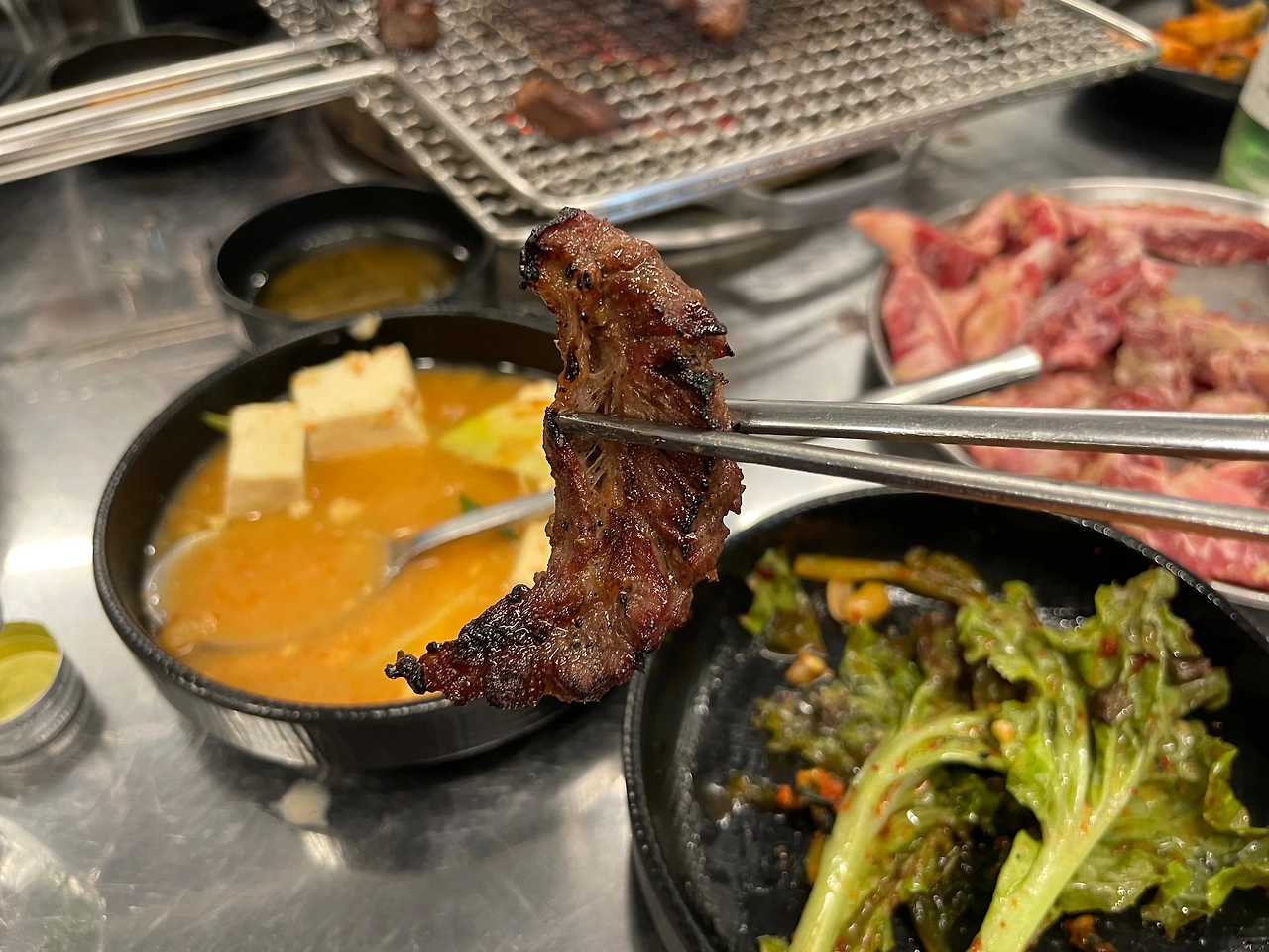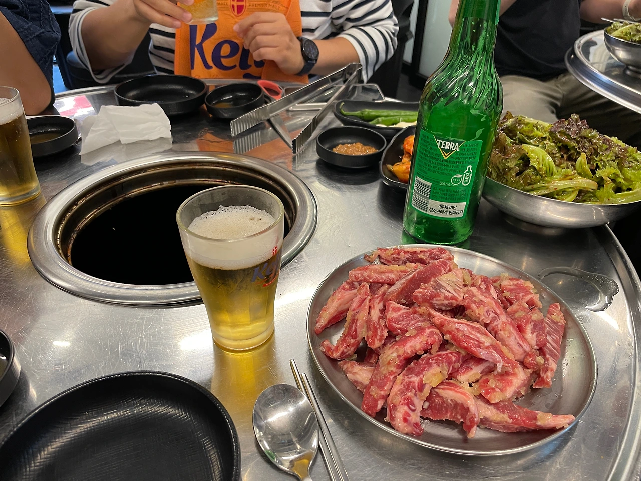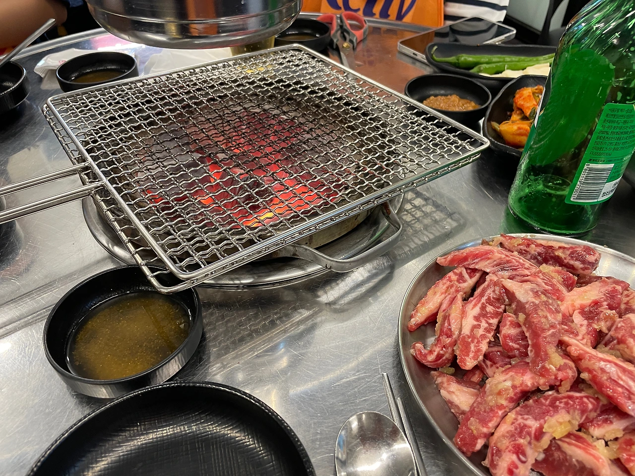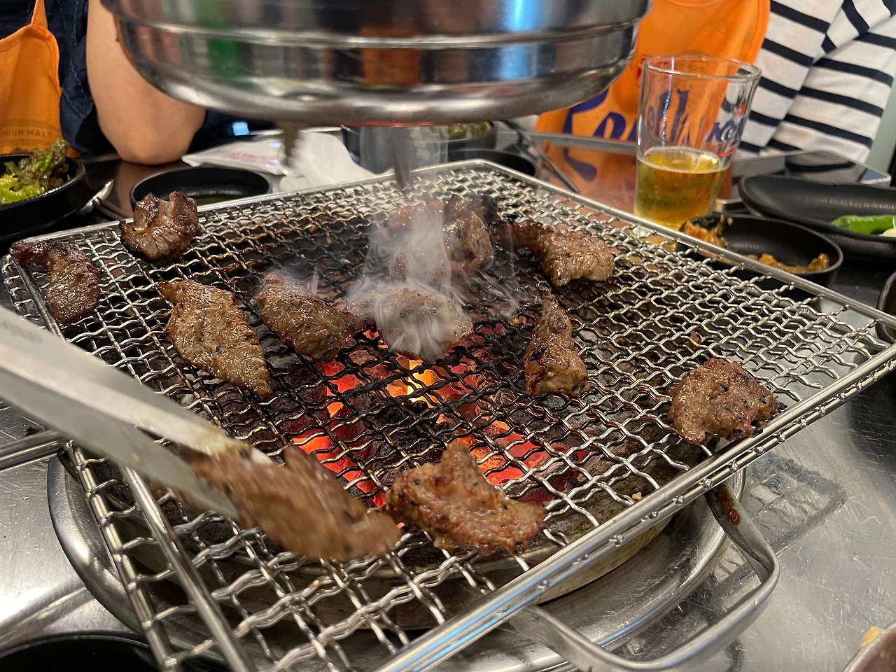 고기는 다진 마늘에 소금 등으로 양념이 되어 있다. 우리가 상상 가능한 바로 그 맛이다. 상추 무침과 같이 먹으면 기가 막힌다.