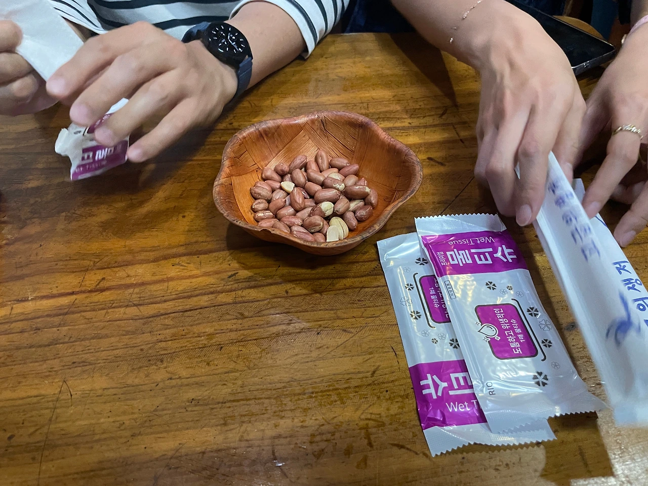 테이블에 땅콩과 화려한 물티슈가 이질적이다.