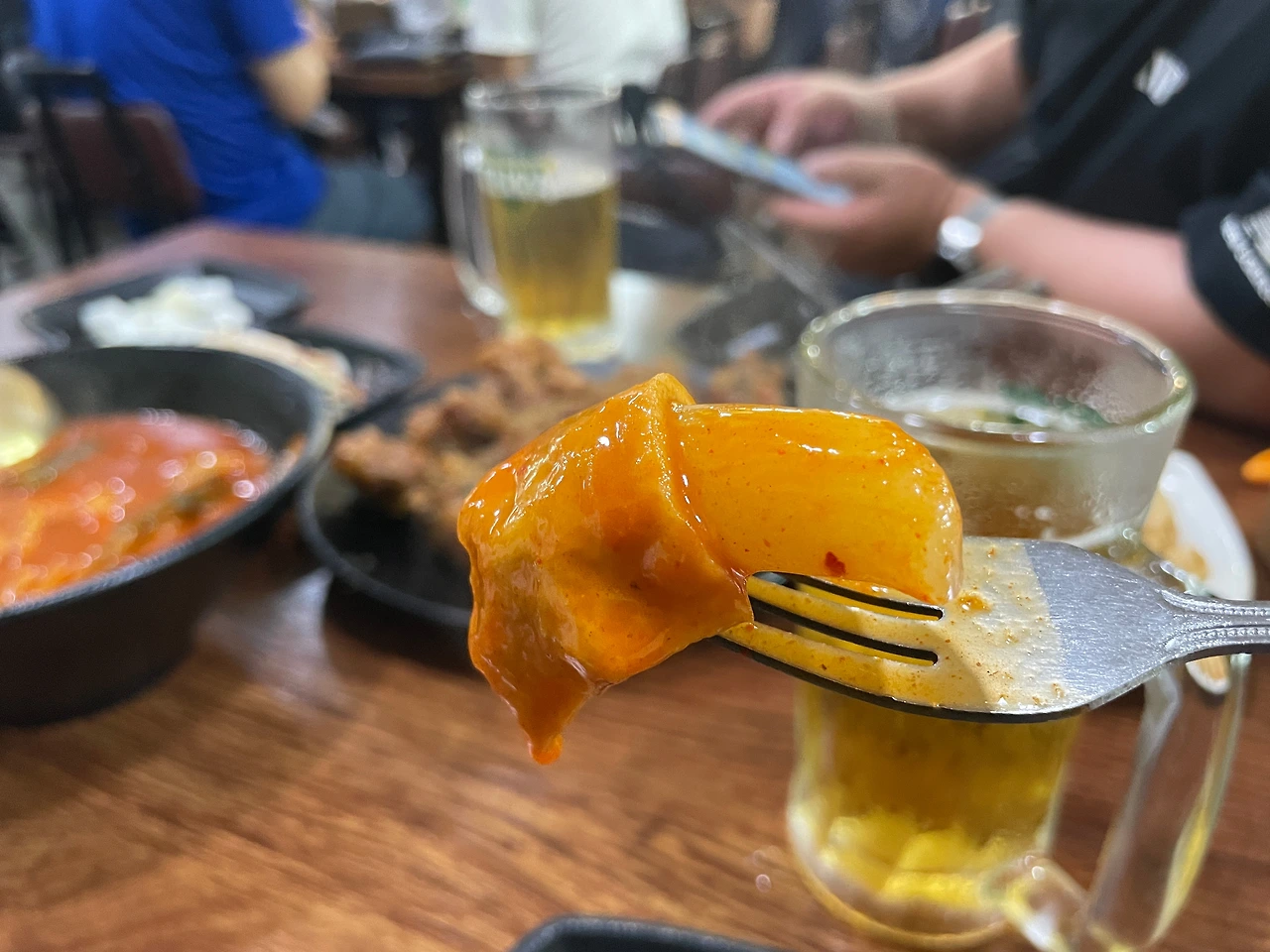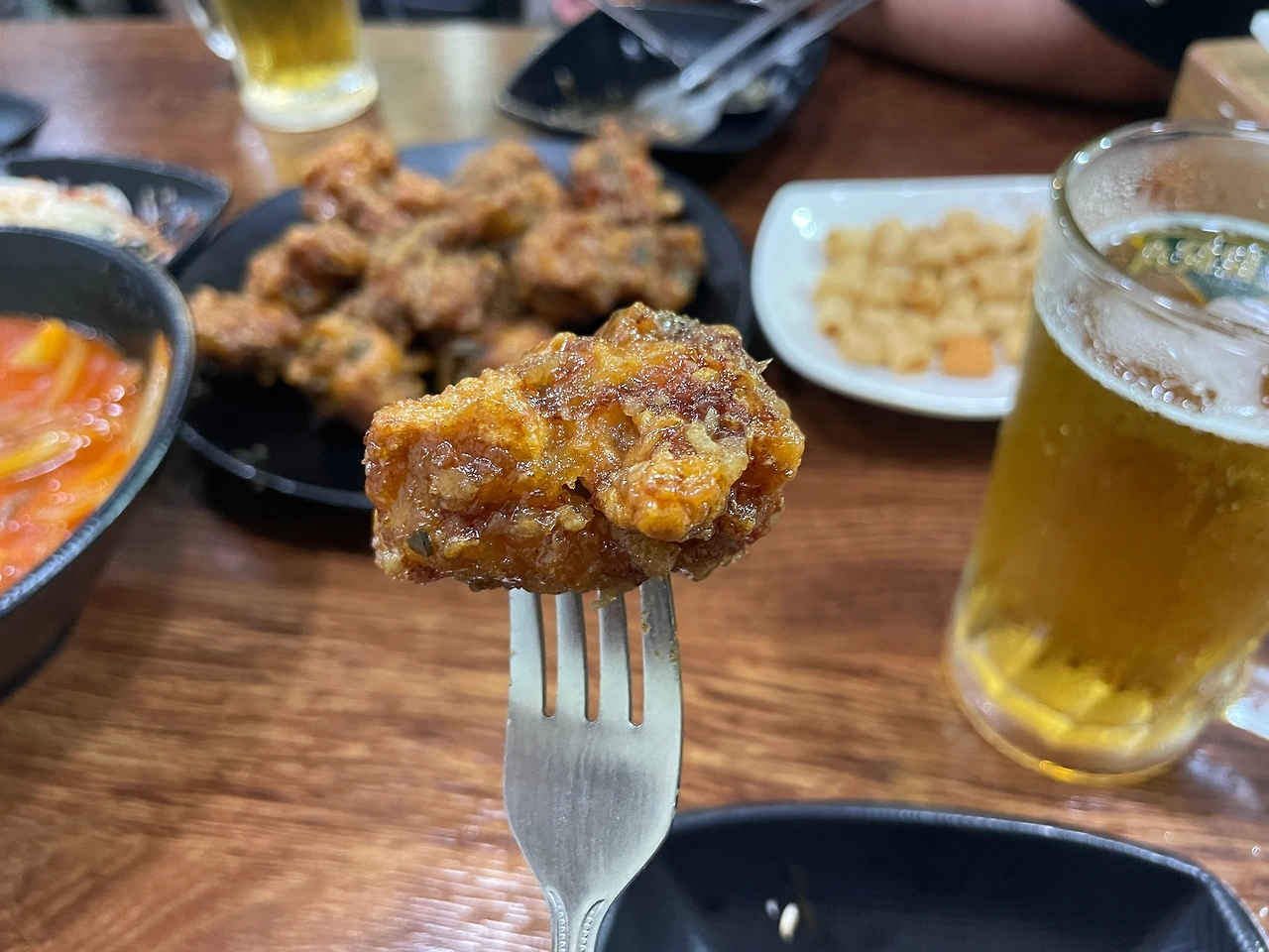 통닭은 닭강정과 비슷한 느낌이다. 마늘향이 강하고, 청양고추가 겉에 입혀져 있어서 맵다.
