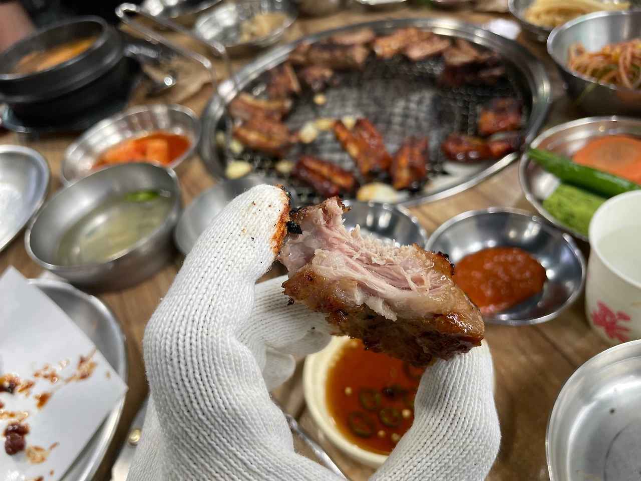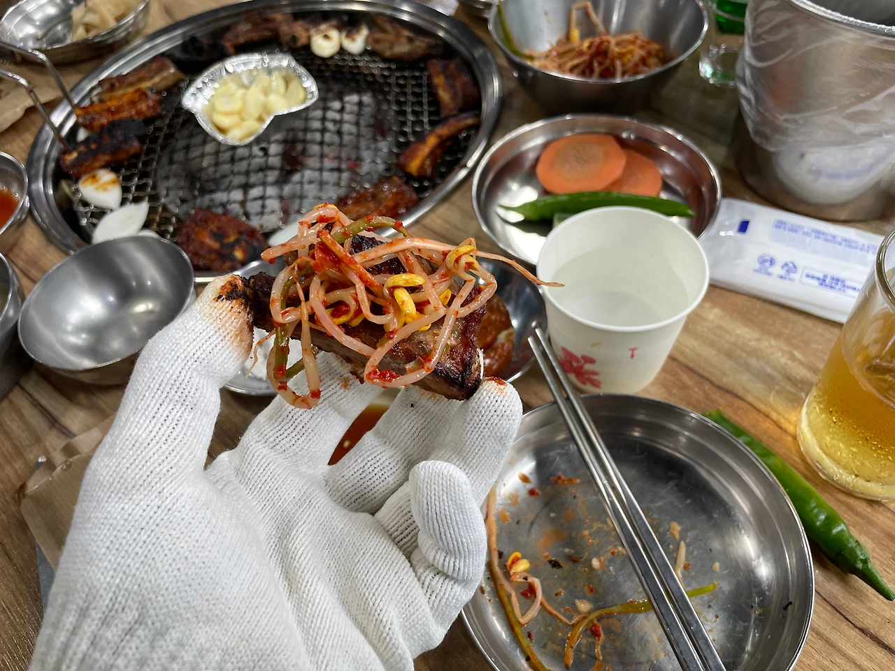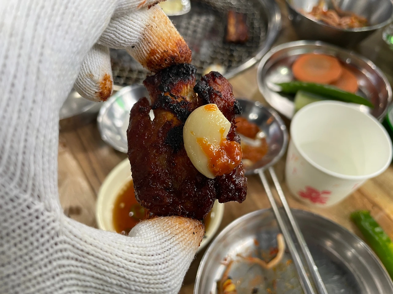 손으로 잡고 뜯어먹어야 해서, 목장갑을 나눠준다.. 아이디어가 좋다. 젓가락보다 편하다. 손으로 들고 먹으니, 뭔가 원초적인 쾌감이 있다. 역시 인간은 손으로 먹는 동물이 맞나 보다.