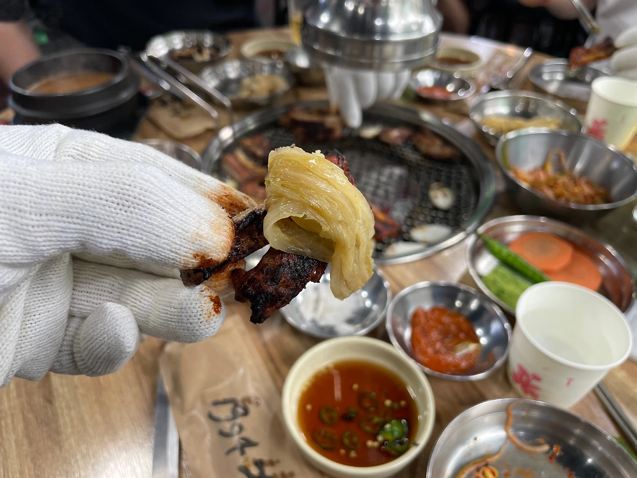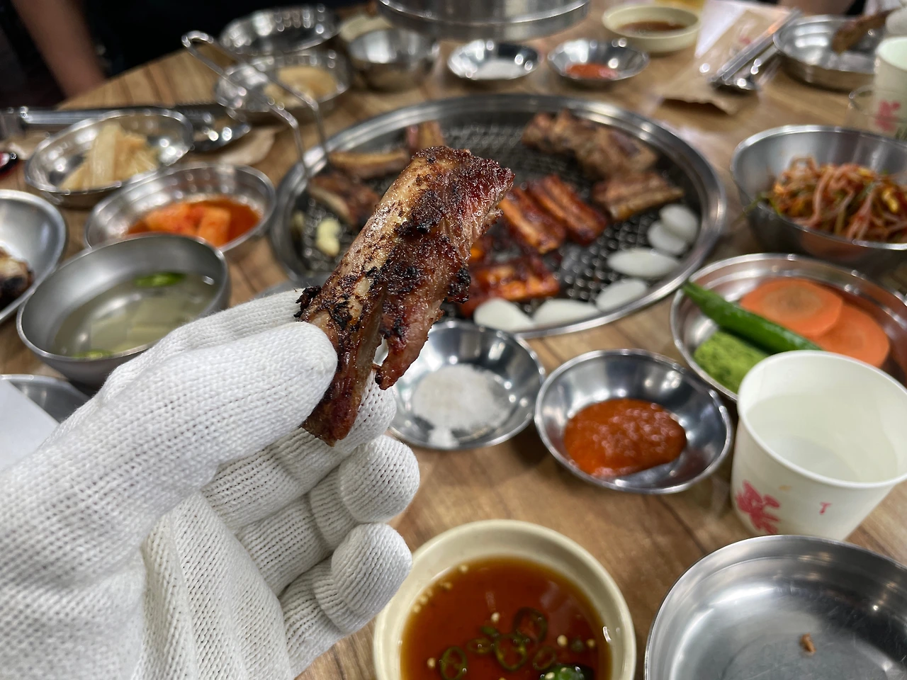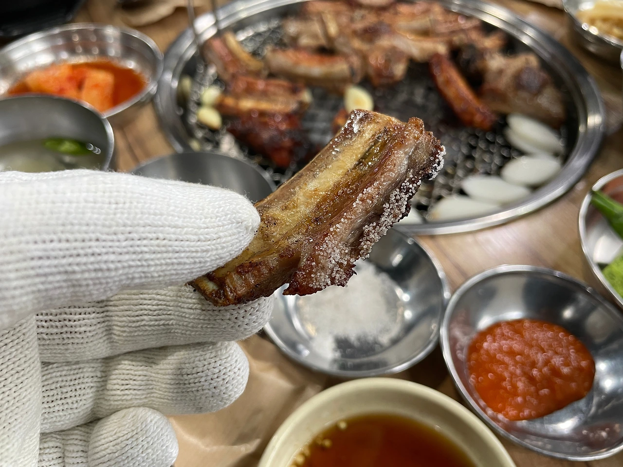 손으로 잡고 뜯어먹어야 해서, 목장갑을 나눠준다.. 아이디어가 좋다. 젓가락보다 편하다. 손으로 들고 먹으니, 뭔가 원초적인 쾌감이 있다. 역시 인간은 손으로 먹는 동물이 맞나 보다.