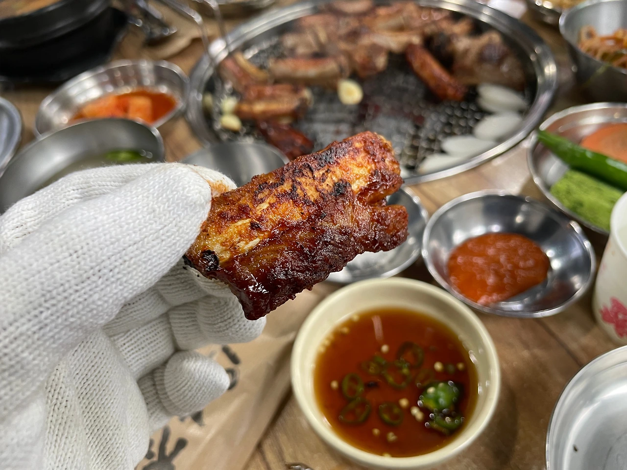 잘 익은 등갈비 하나를 집어 들어 한 입 베어 물었다.