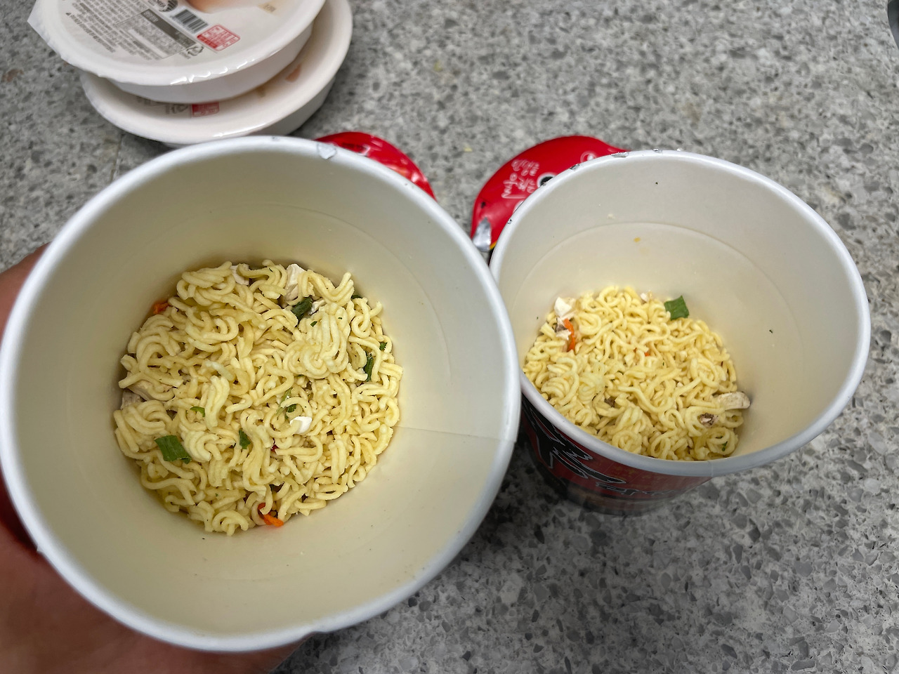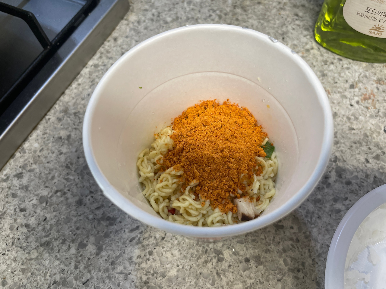 부서진 면을 다시 컵라면 용기에 옮겨 담는다.