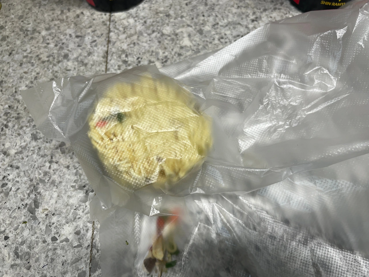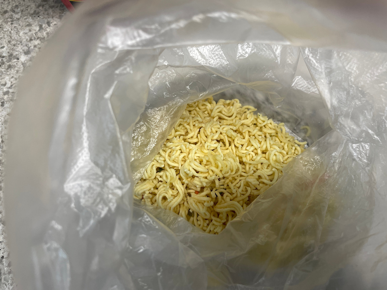 볶음밥에 넣어야 하니까, 면만 꺼내서 비닐봉지에 넣고 잘게 부순다.
