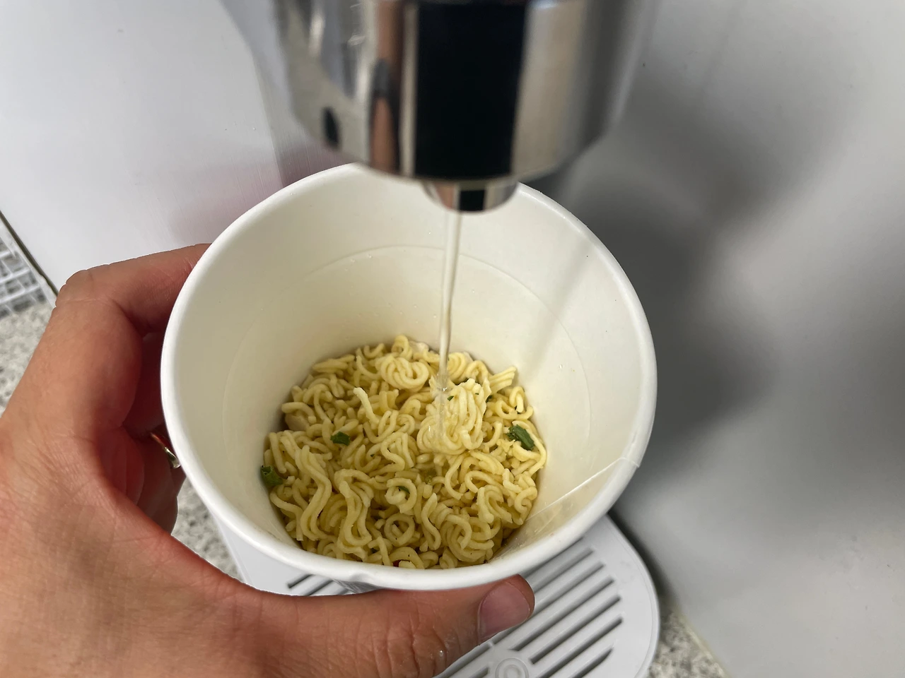 잘게 부순 면에 뜨거운 물을 넣는다.