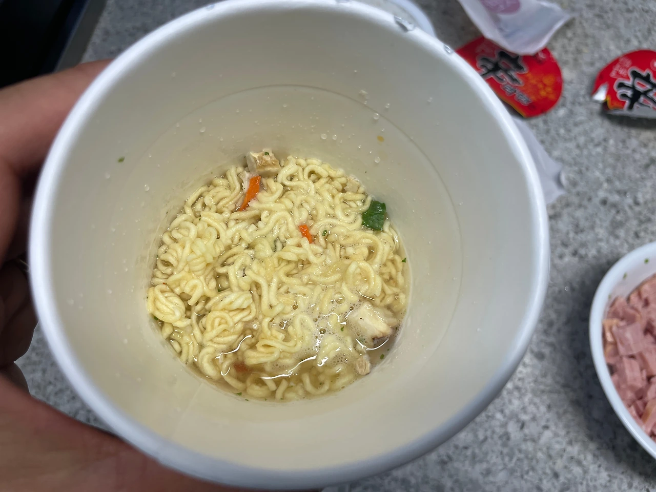 볶음밥을 할 거니까, 뜨거운 물은 많이 필요 없다. 면이 익을 정도만. 정량에서 50%만 받는다. 물을 받아서 일단 그대로 익게 둔다.