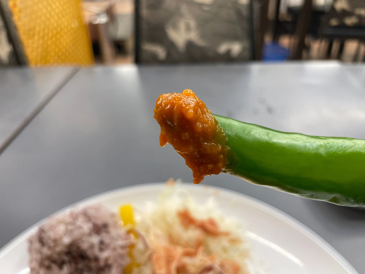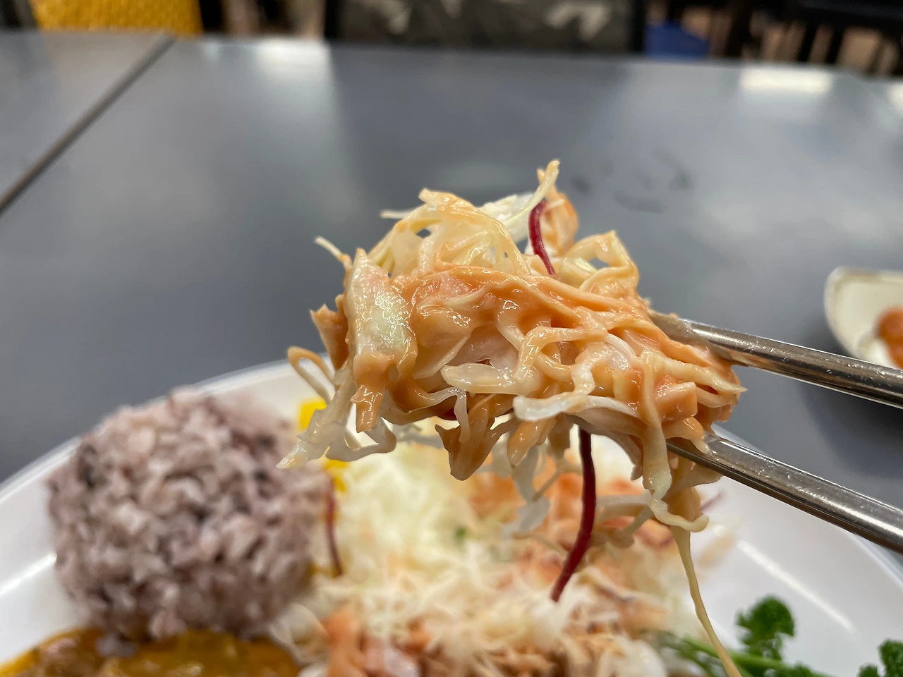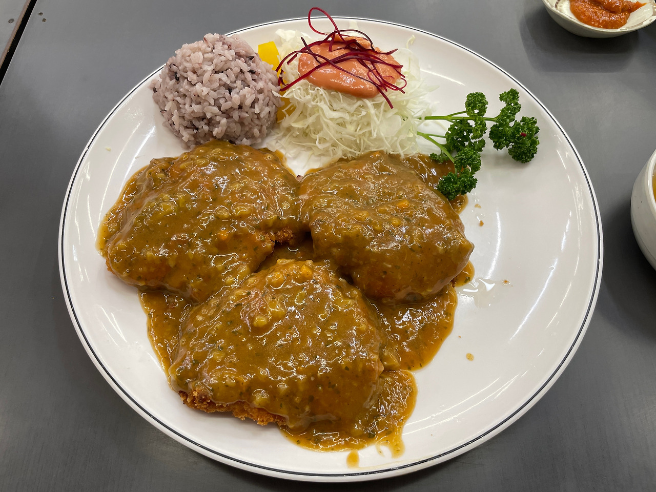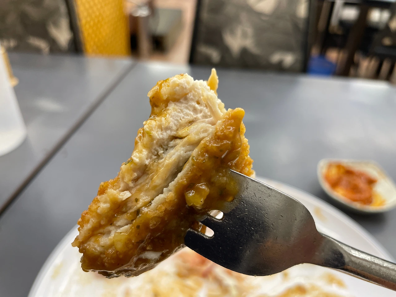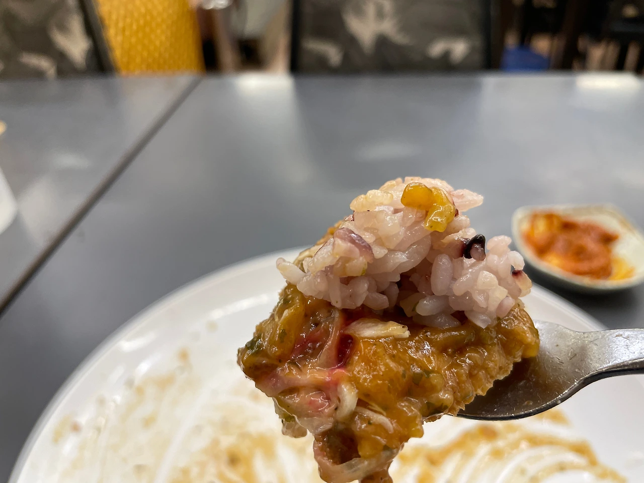 소스는 건더기가 들어있는 게, 비주얼이 마치 카레 같다. 하지만 맛은 카레와 전혀 상관없다. 오히려 새콤 달콤한 쪽에 가깝다. 짭짤한 느낌은 전혀 없다. 겨자맛이 흐릿하게 나는 달콤 새콤.