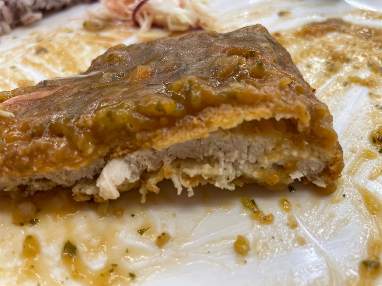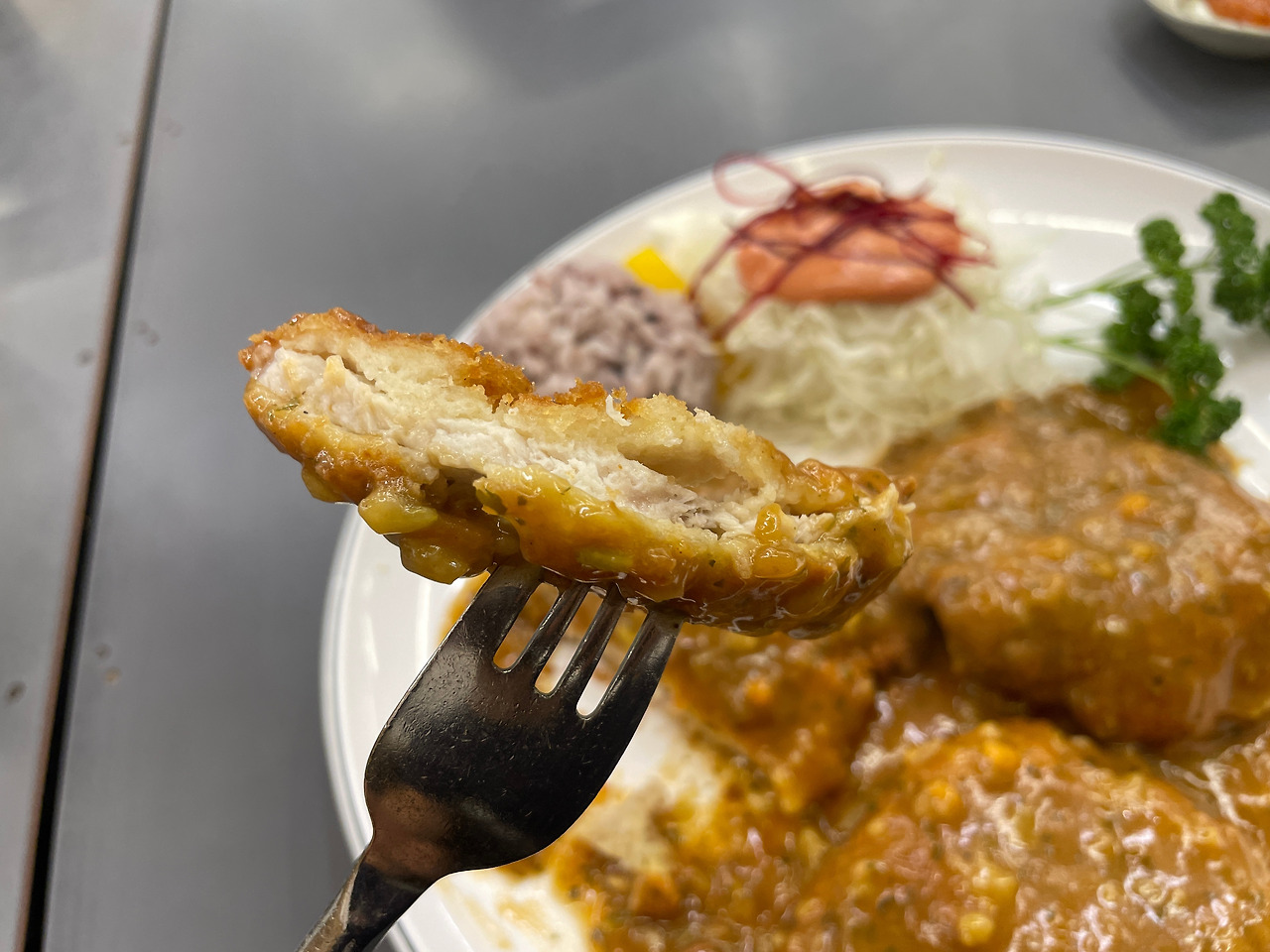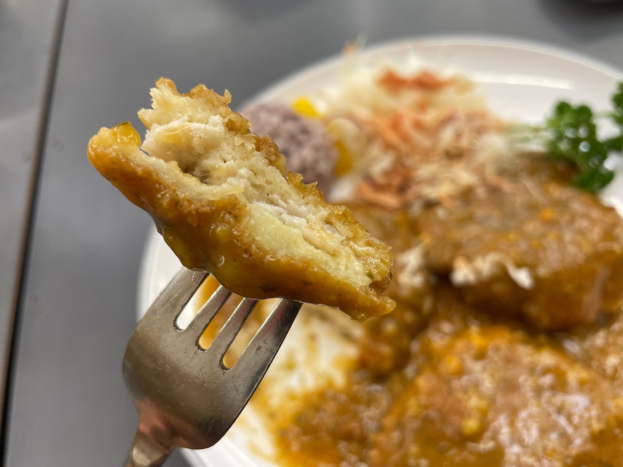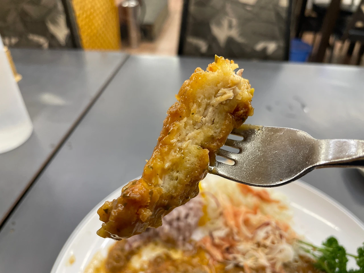 두께는 대충 이 정도. 고기 씹는 맛이 있다. 근데 튀김옷과 고기가 자꾸 분리되더라. 섭섭하게.