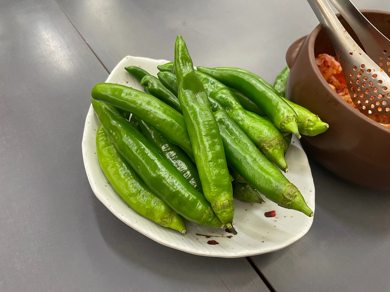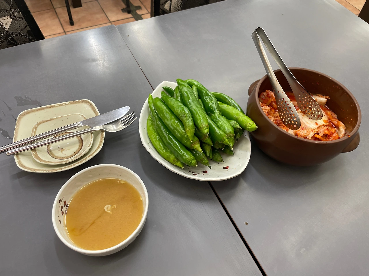 자리에 김치와 고추가 놓여 있다. 주문하자마자 바로 장국과 포크/나이프가 세팅된다.