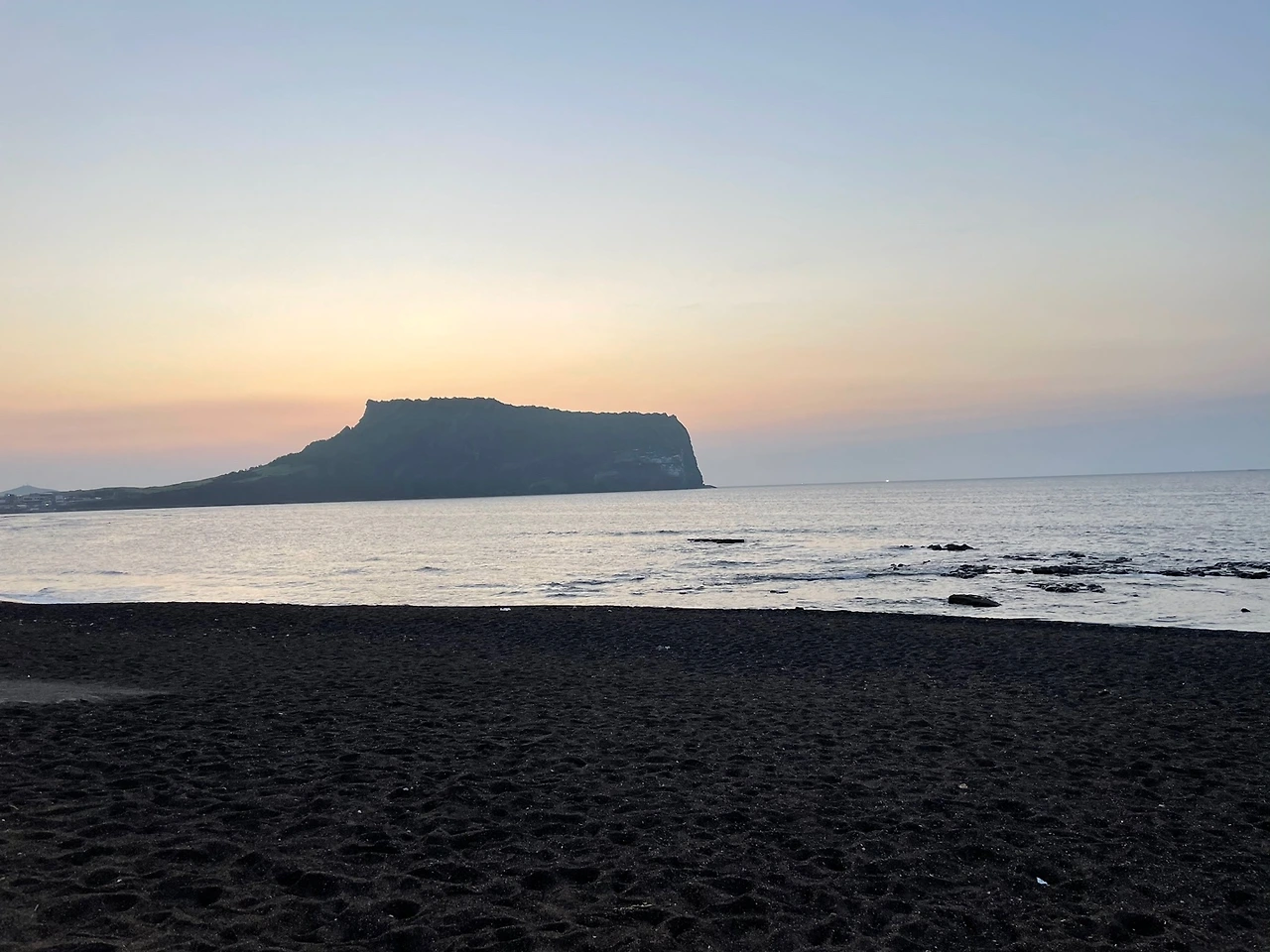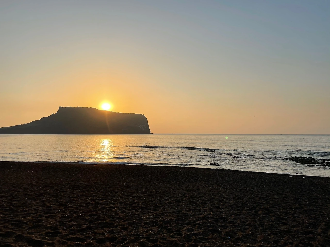 광치기 해변에 의자를 펼쳐놓고, 조용히 성산일출봉 쪽을 바라봤다. 해는 5:25에 떴지만, 성산일출봉 위로 올라오기까지는 조금 시간이 걸렸다. (성산일출봉 위에서 봤다면 바다 위로 솟는 태양을 곧바로 볼 수 있었겠지.) 드디어 따뜻하고 작은 오렌지 빛 태양이 솟아오른다.