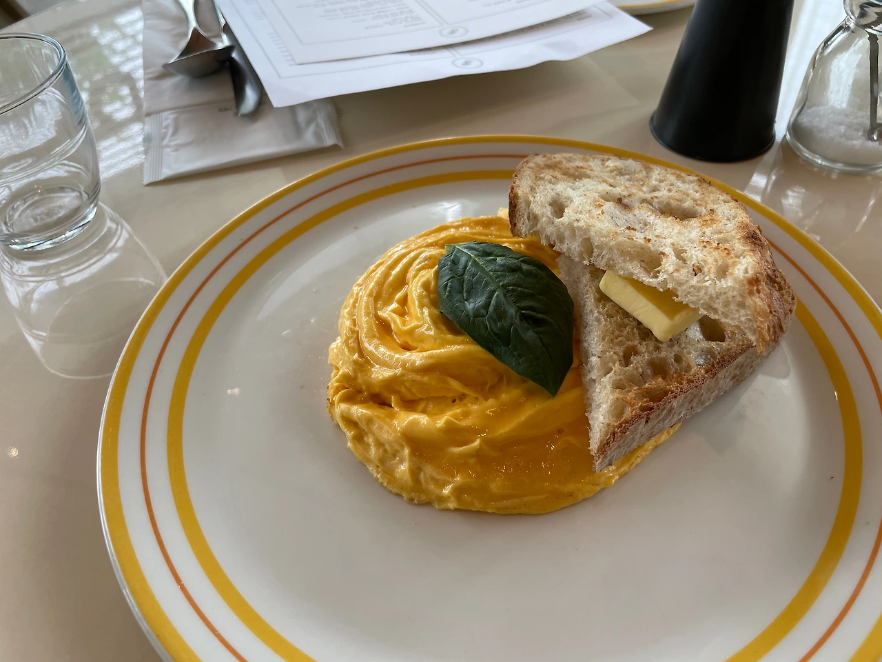 스크램블이 두껍다. 근데 부드럽다. 푹신푹신하다. 소금을 조금 올려 먹으니 간이 딱 알맞다.