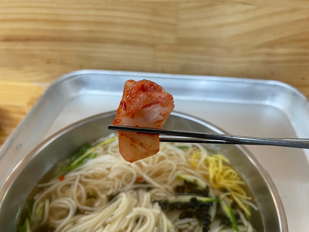 칼국수에 겉절이가 어울린다면, 잔치국수엔 신김치가 좋다.