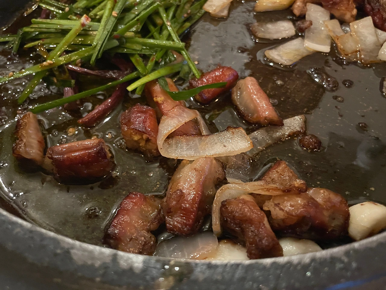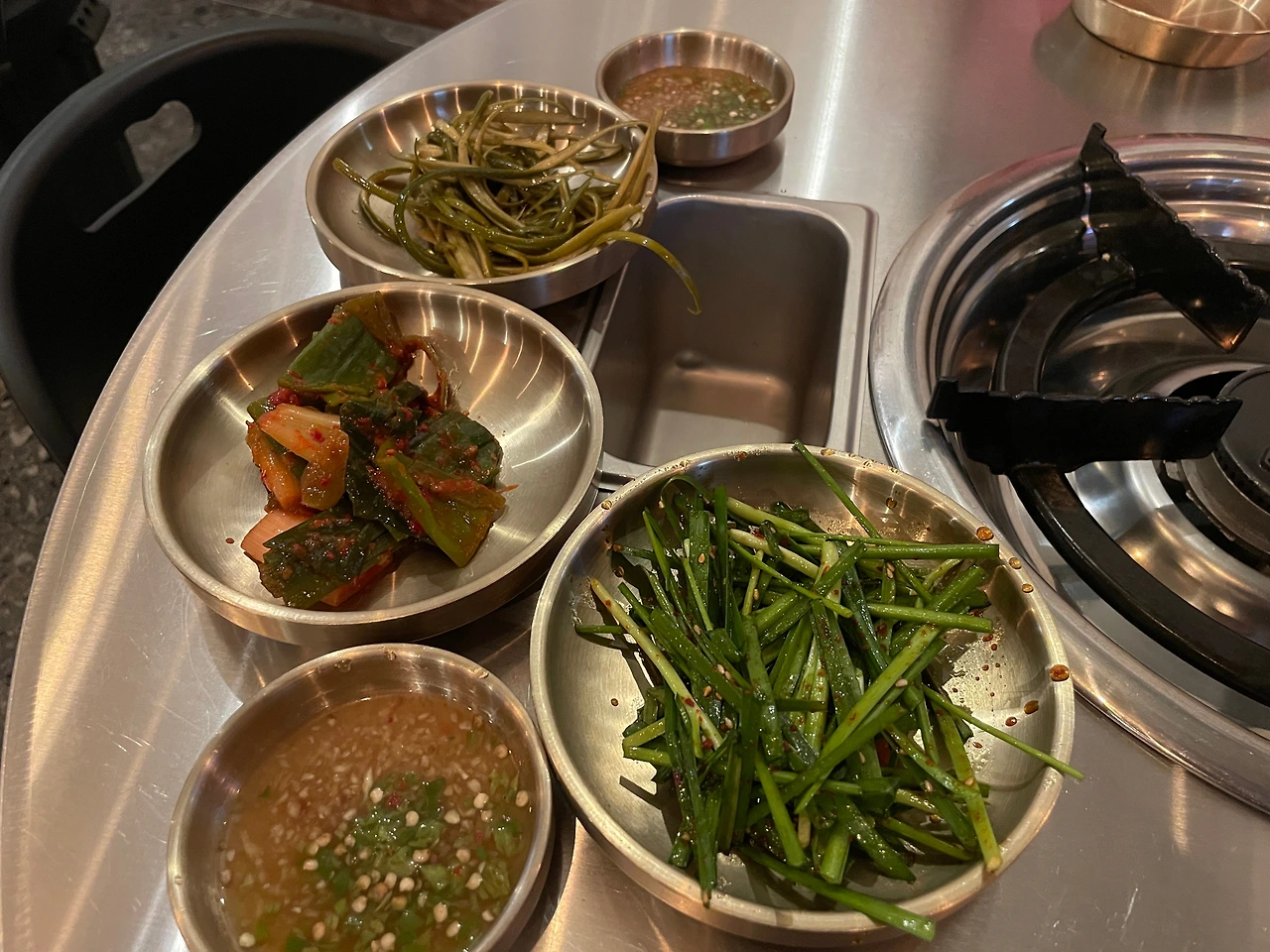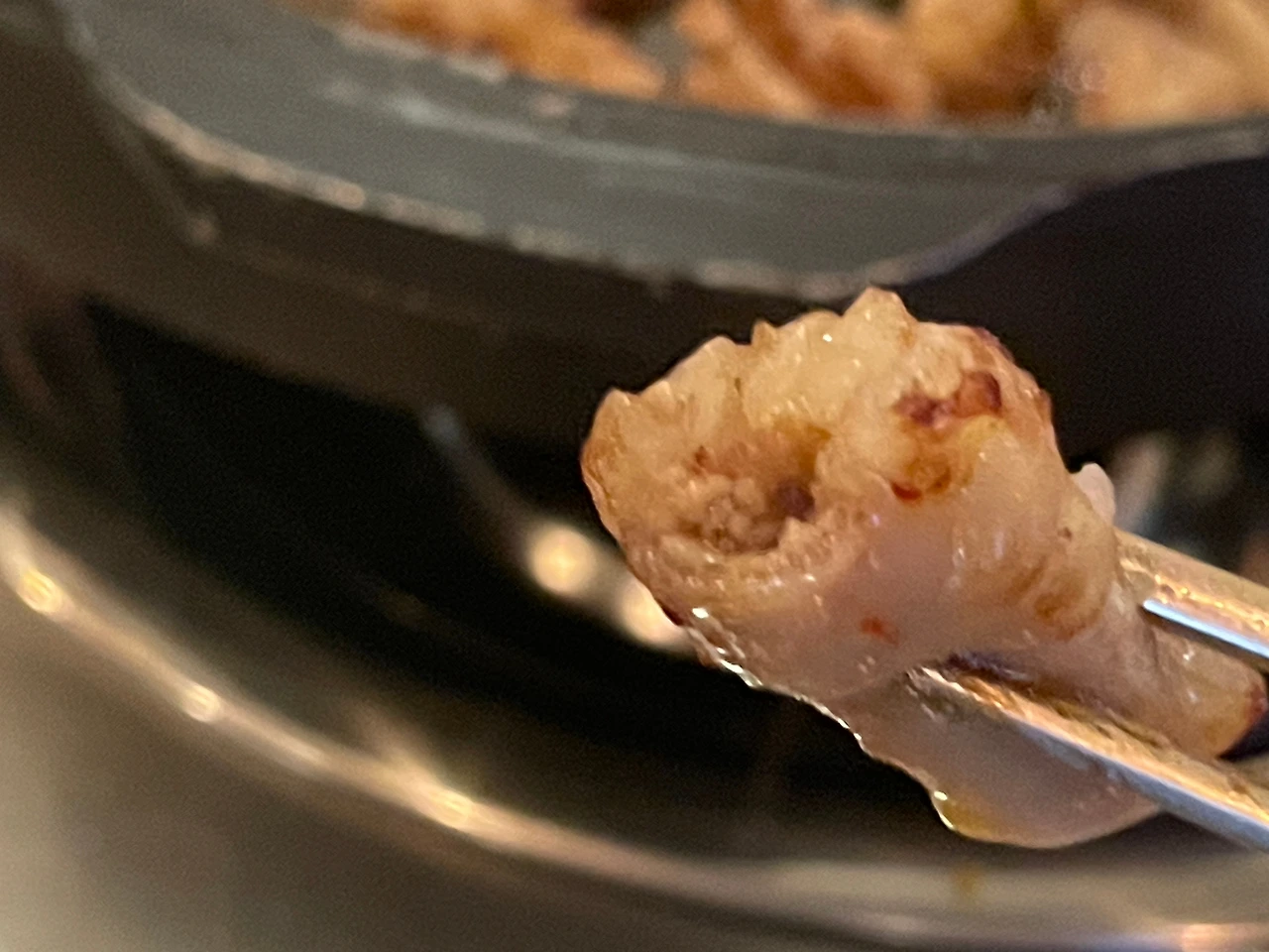 야채와 마늘이 곱창기름에 코팅되어 구워진다.