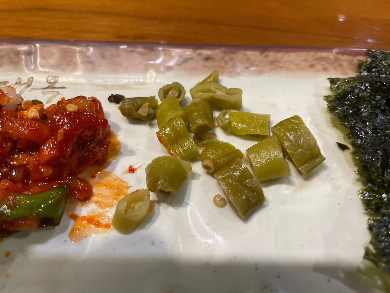 고추절임은 맵지만 새콤함이 더해져서 피클처럼 입을 정화해 준다.