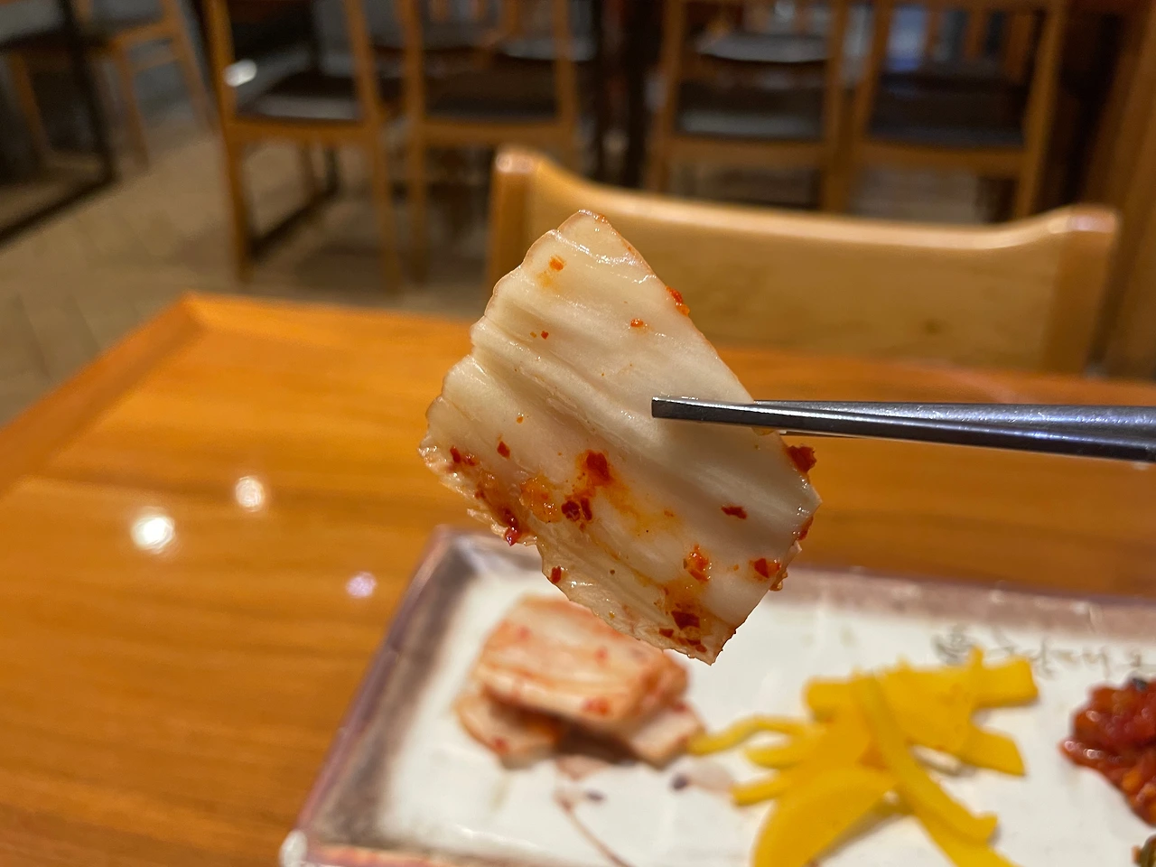 김치는 흔한 중국 수입김치가 아닌, 적당히 익은 김장김치 맛이다.