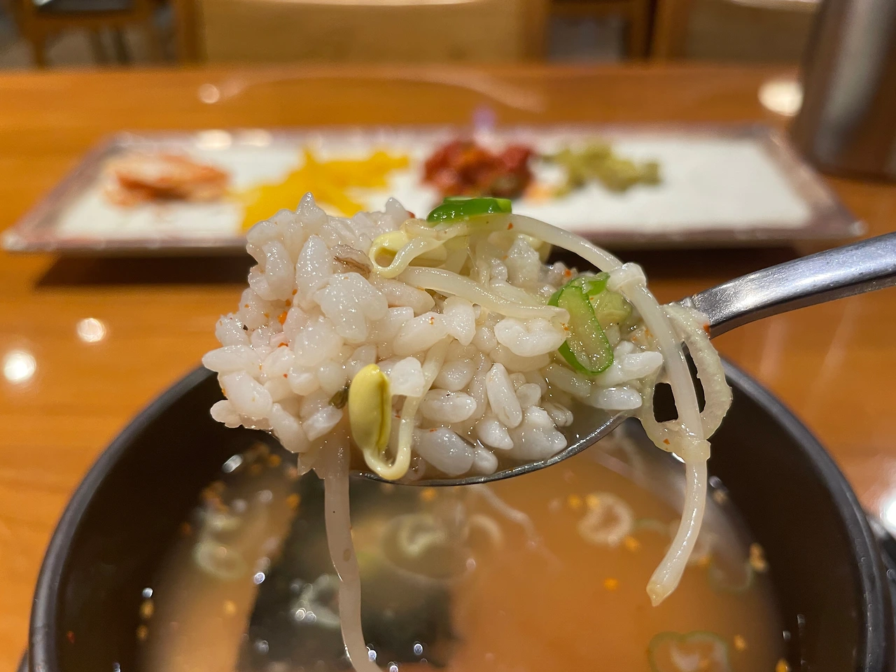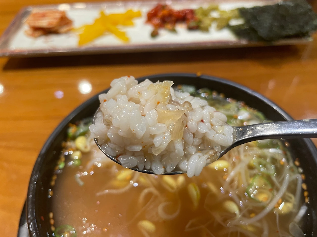 그럴 땐 콩나물 국밥이 제격이다. 심심할 정도로 단조로운 국물에 밥을 말아먹으면, 예전 어머니가 끓여서 식탁에 놓아주던 국이 떠오른다. 밥 말아서 후루룩 먹기 딱 좋은 농도와 맛.