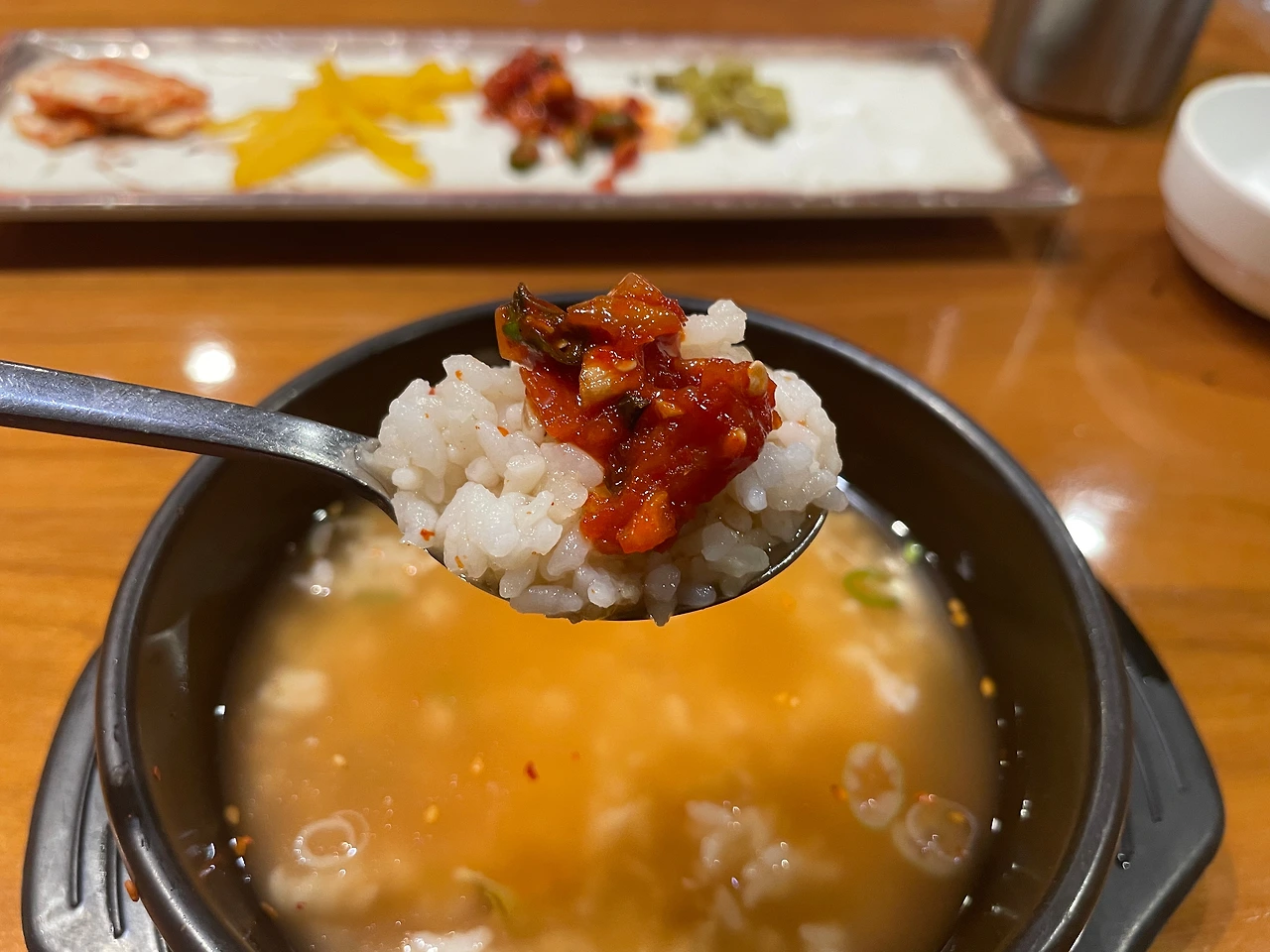 밥 한 숟갈을 떠먹으니, 매콤하고 짭짤한 맛이 뜨끈하게 입 안 가득 찬다.