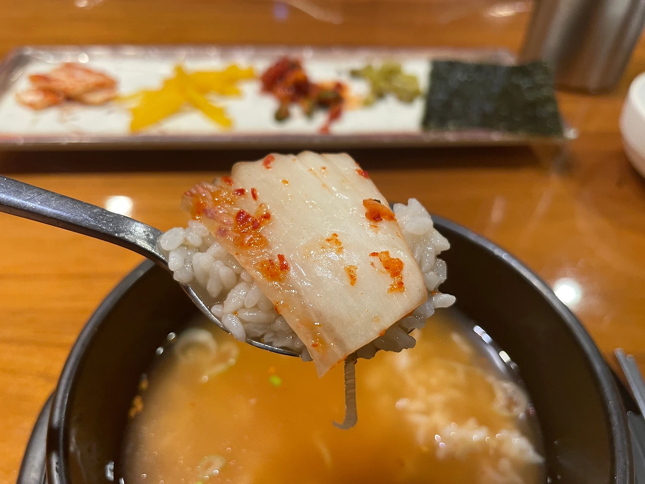 김치를 올려 먹으면 배추의 단 맛이 국밥과 잘 어울린다.
