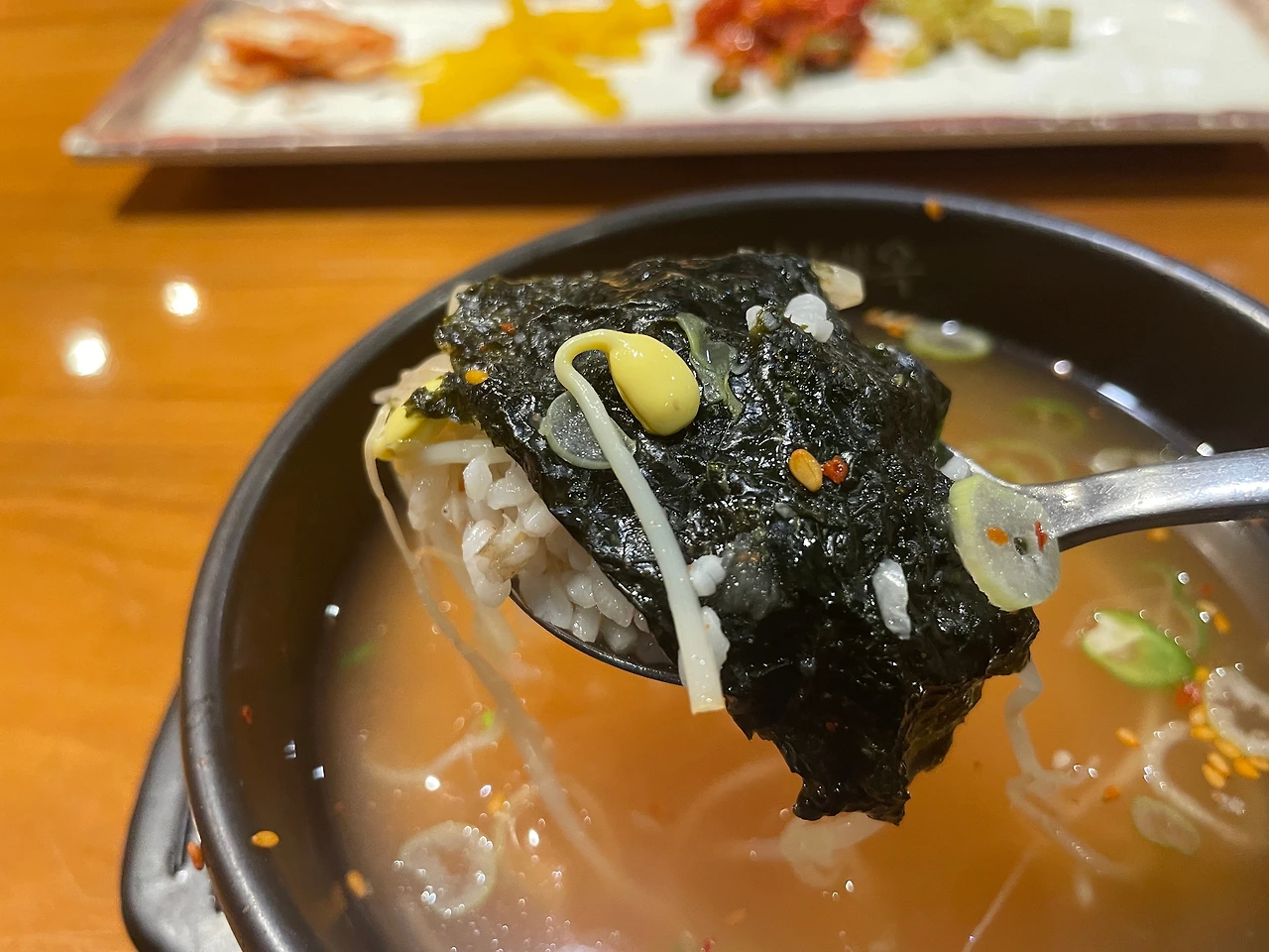 김을 올려서 먹으면 비로소 이 국밥이 완성된다.