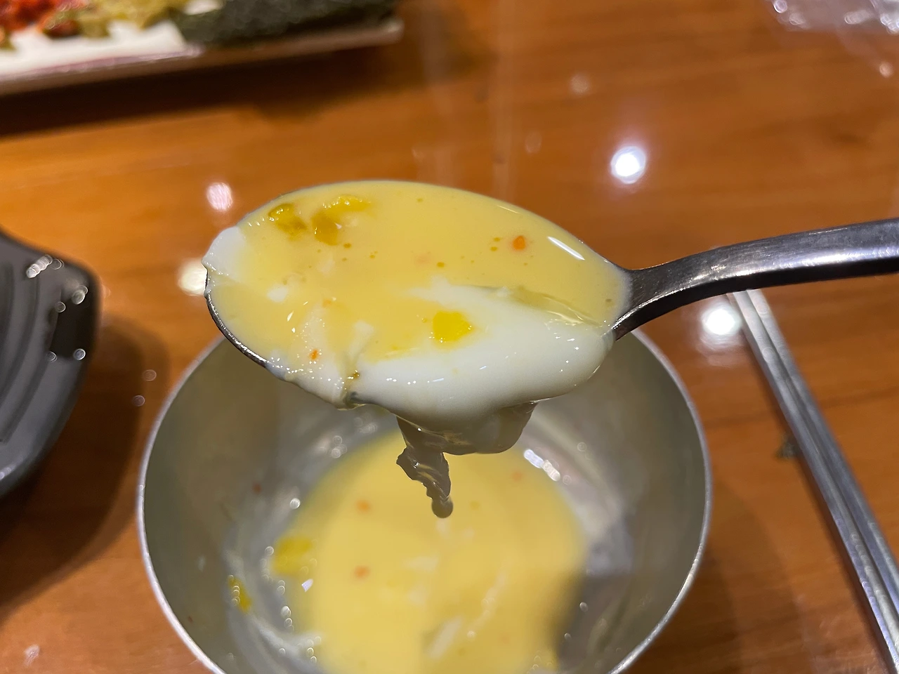 뜨거운 콩나물 국물을 부어서 계란을 살짝 익혀 먹으면 부럽고 고소하다.