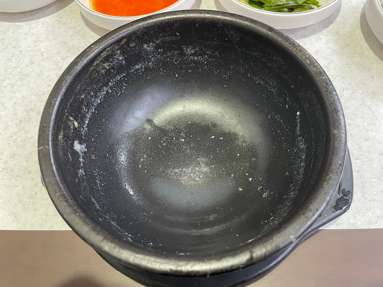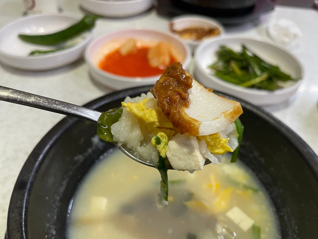 중간쯤 먹으면 국물이 이런 모양새를 띤다. 나는 이 때 국밥의 분위기를 좋아한다. 잘 정제된 진한 엑기스의 모양.