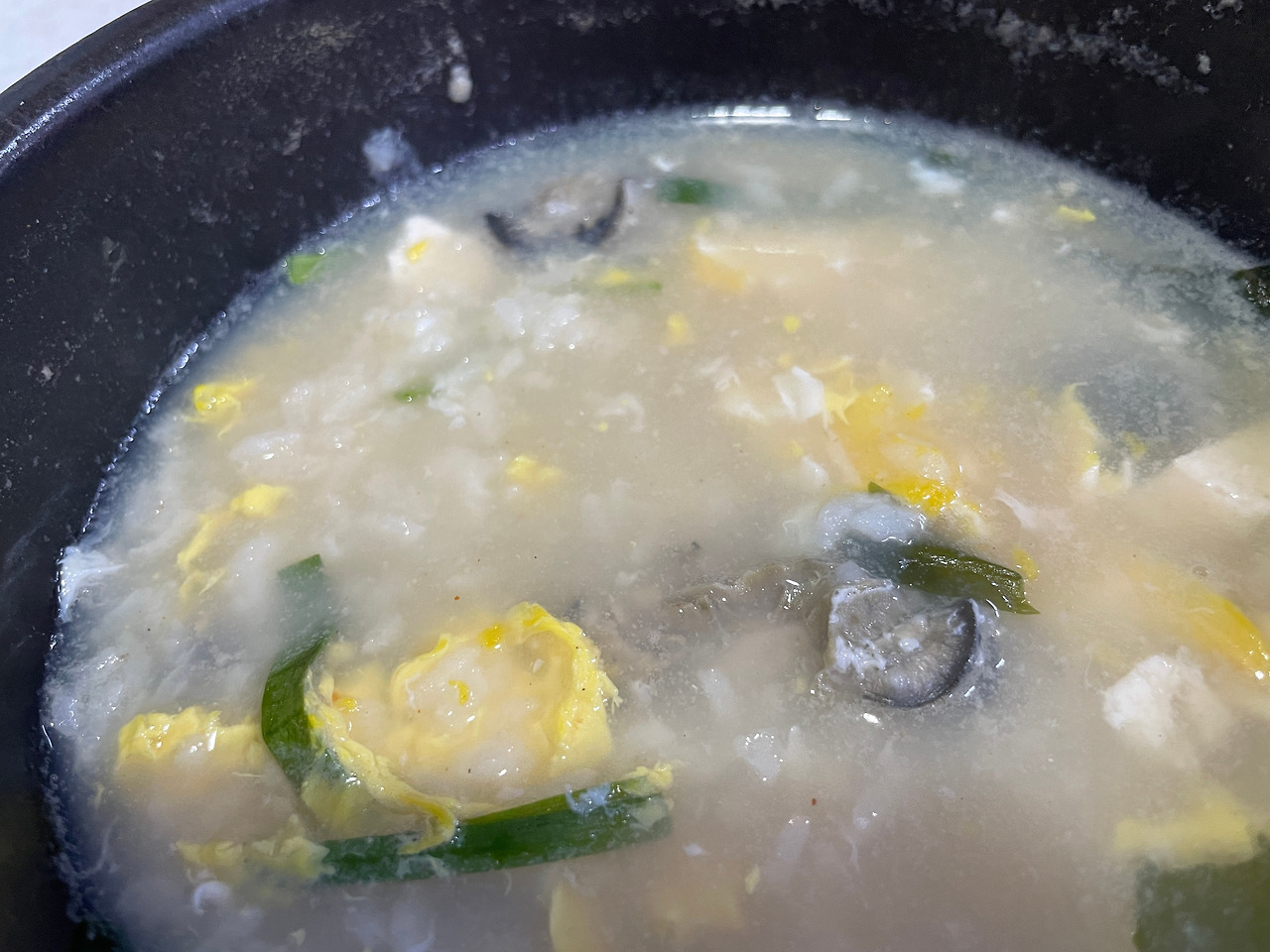 약간 점성이 있는 국물. 미역, 두부, 부추 등이 들어가 있다. 굴은 물론 잔뜩.